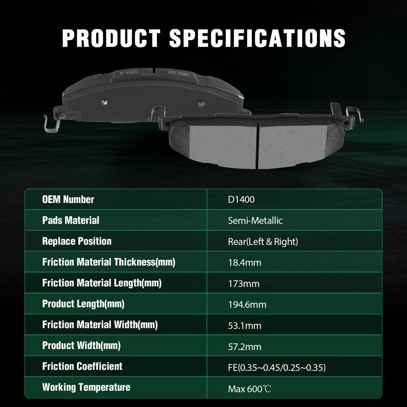 Automuto 4Pcs Rear Semi-Metallic Disc Brake Pads Set D1400 For Dodge Ram 1500, 2500, 3500 Promaster