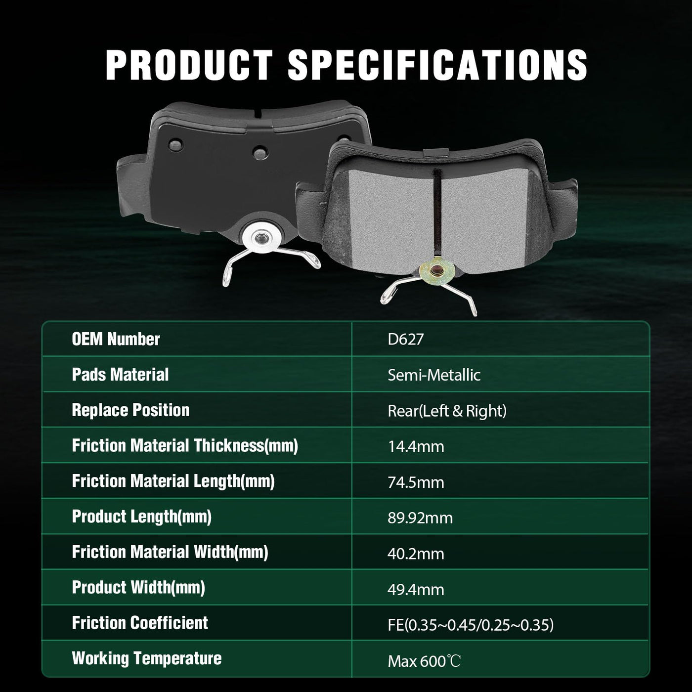 Fits:1994-2004 For Ford For Mustang 3.8L2004 For Ford For Mustang 3.9L1996-2004 For Ford For Mustang 4.6L1994-1995 For Ford For Mustang 5.0L2000 For Ford For Mustang 5.4L1995 For Ford For Mustang 5.8LSpecifications:1)Placement on Vehicle: Rear Left and Right2)Brake Pad Material: Semi-Metallic3)OEM Part Numbers: ATD627C,D627-7524Package Including:4*Semi-Metallic Disc Brake Pads Set