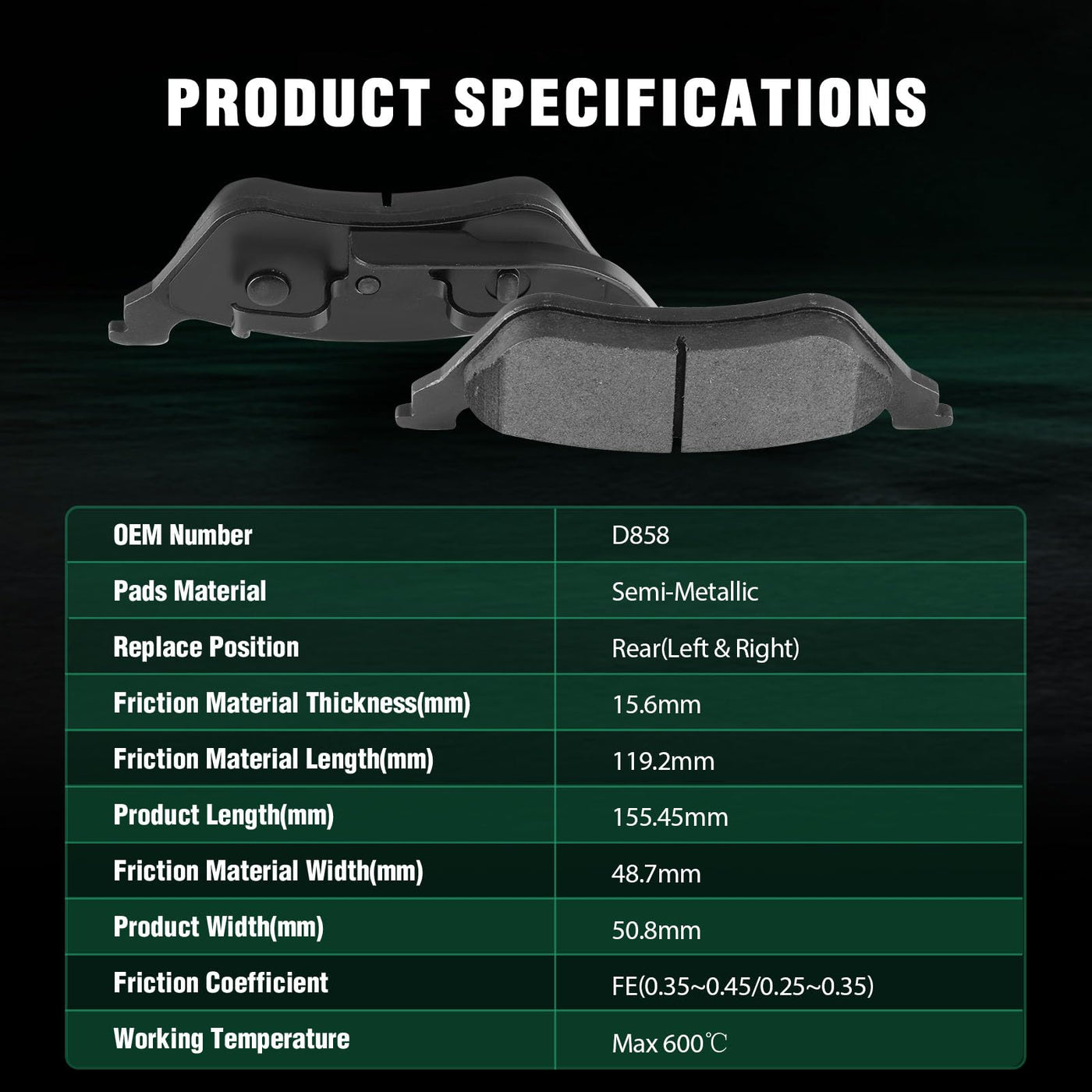 Fits:2001-2007 For Chrysler Town & Country 3.3L2001-2007 For Chrysler Town & Country 3.8L2001-2007 For Dodge Caravan 2.4L2001-2007 For Dodge Caravan 3.3L2001-2007 For Dodge Grand Caravan 3.3L2001-2007 For Dodge Grand Caravan 3.8LSpecifications:1)Placement on Vehicle: Rear Left and Right2)Brake Pad Material: Semi-Metallic3)OEM Part Numbers: D858-7734Package Including:4*Semi-Metallic Disc Brake Pads Set