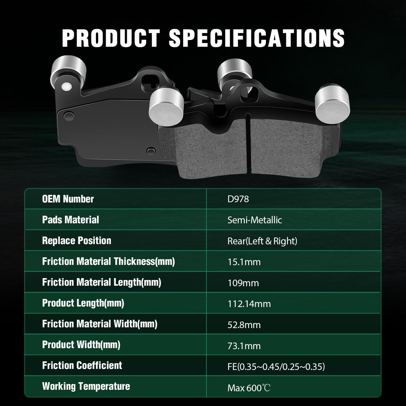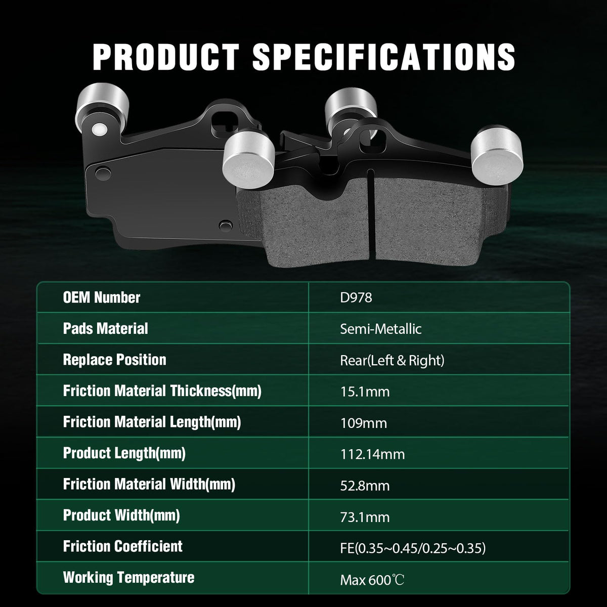 Automuto 4Pcs Rear Semi-Metallic Disc Brake Pads Set D978 For Audi Q7 2007-2015,For Porsche Cayenne 2003-2006 2008-2010,For Volk
