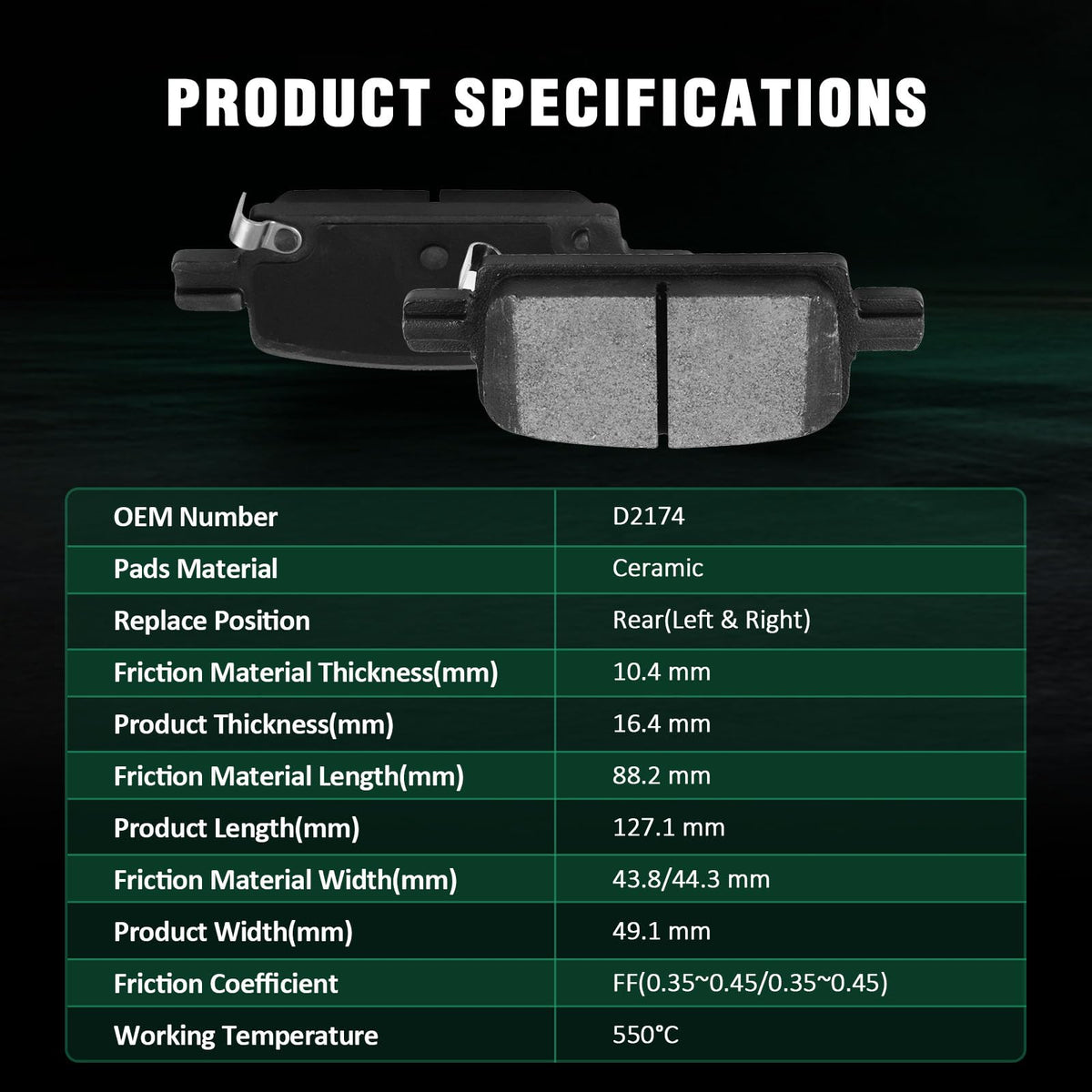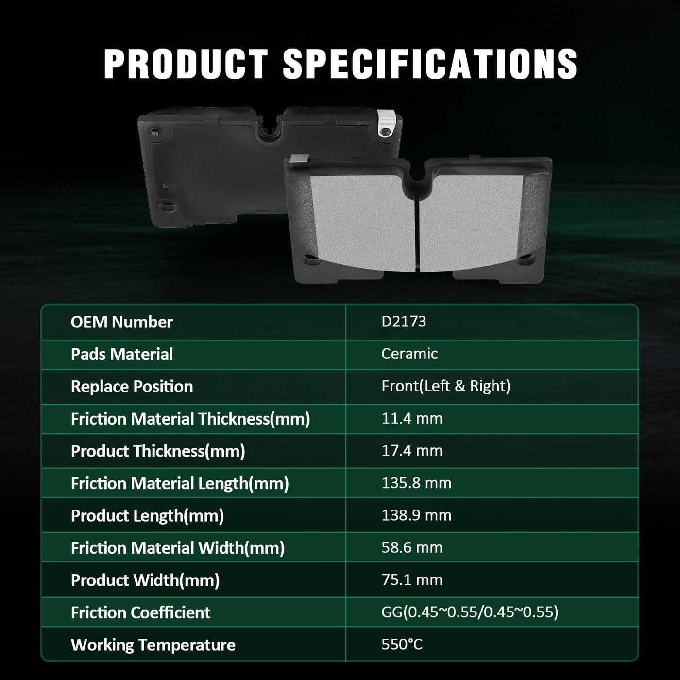 Fits:For Cadillac Escalade 2021-2022For Cadillac Escalade ESV 2021-2022For Chevrolet Silverado 1500 2019-2022For Chevrolet Silverado 1500 LTD 2022For Chevrolet Suburban 2021-2022For Chevrolet Tahoe 2021-2023For GMC Sierra 1500 2019-2022For GMC Sierra 1500 Limited 2022For GMC Yukon 2021 2023For GMC Yukon XL 2021Specifications:1)Placement on Vehicle:Front & Rear2)Brake Pad Material:Ceramic-Front Left & RightCeramic-Rear Left & Right3)OEM Part Numbers:D2173-9418-Front Left & RightD2174-9419-Rear Left & RightPackage Including:8*Ceramic Brake Pads Set