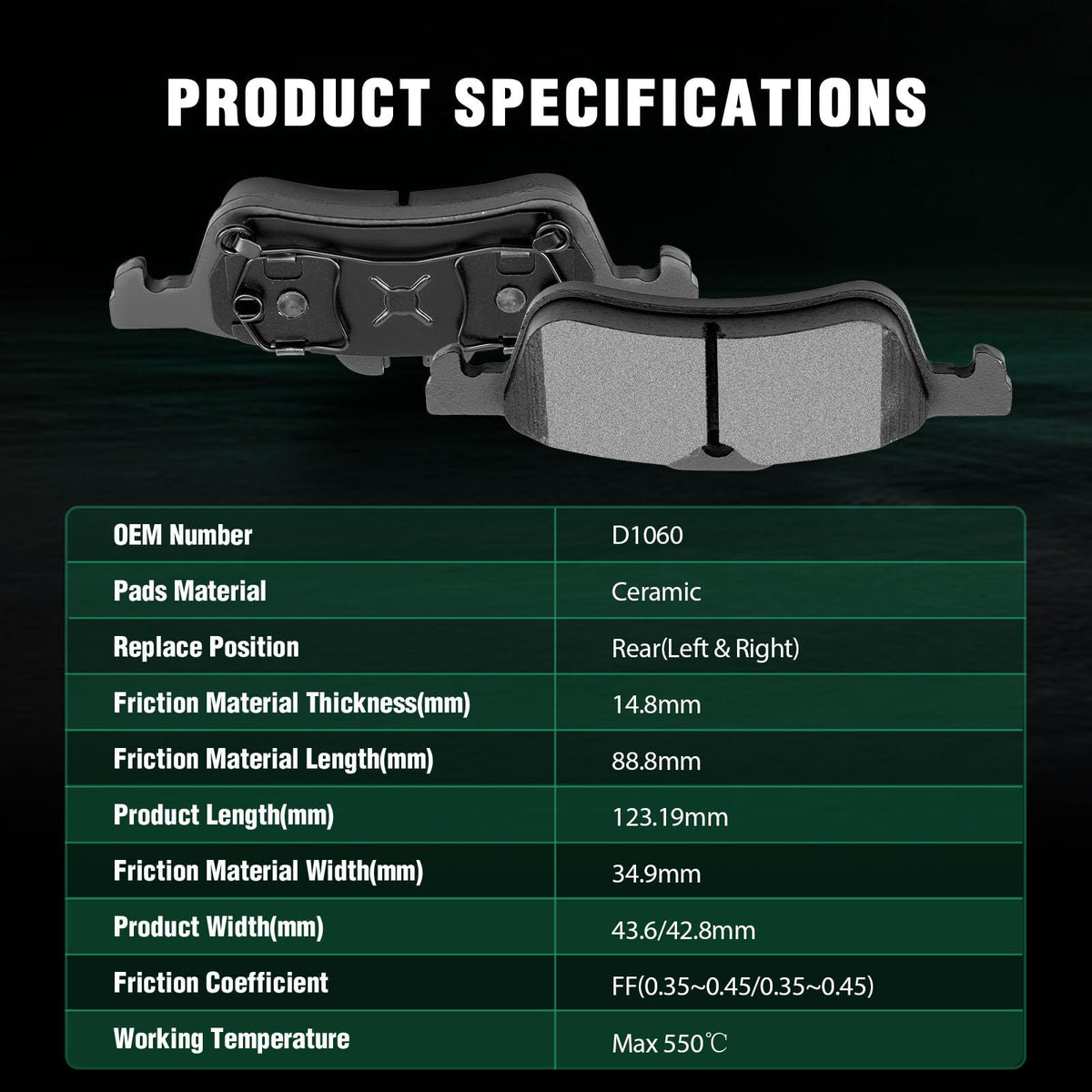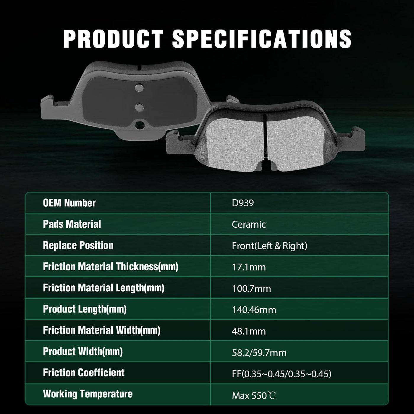 Fits:2002-2008 For Mini Cooper 1.6LSpecifications:1)Placement on Vehicle:Front & Rear2)Brake Pad Material:Ceramic-Front Left and RightCeramic-Rear Left and Right3)OEM Part Numbers:308.09390,MGD939M,D939-7841-Front Left and Right308.10600,EHT1060,D1060-7842-Rear Left and RightPackage Including:8*Ceramic Disc Brake Pads Set