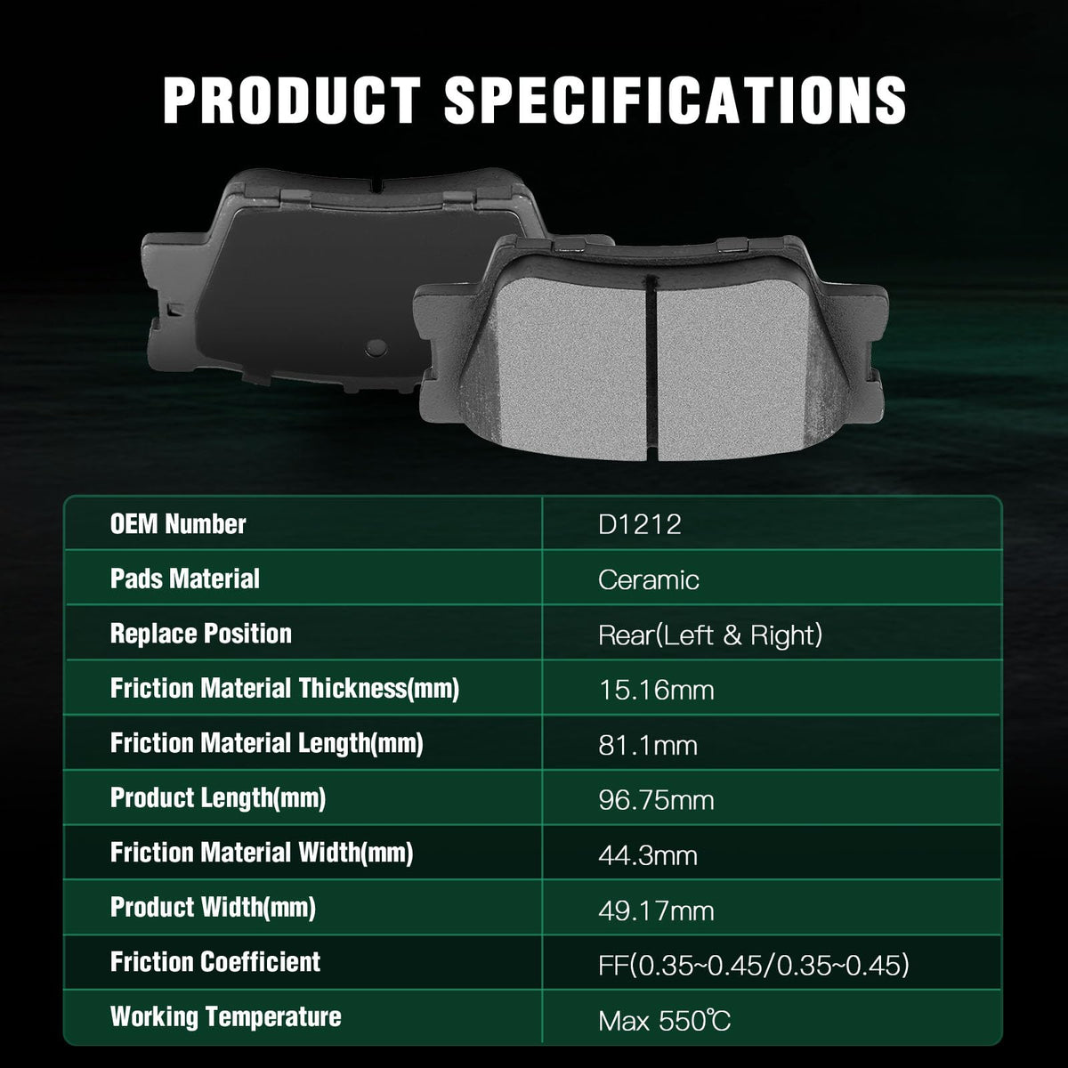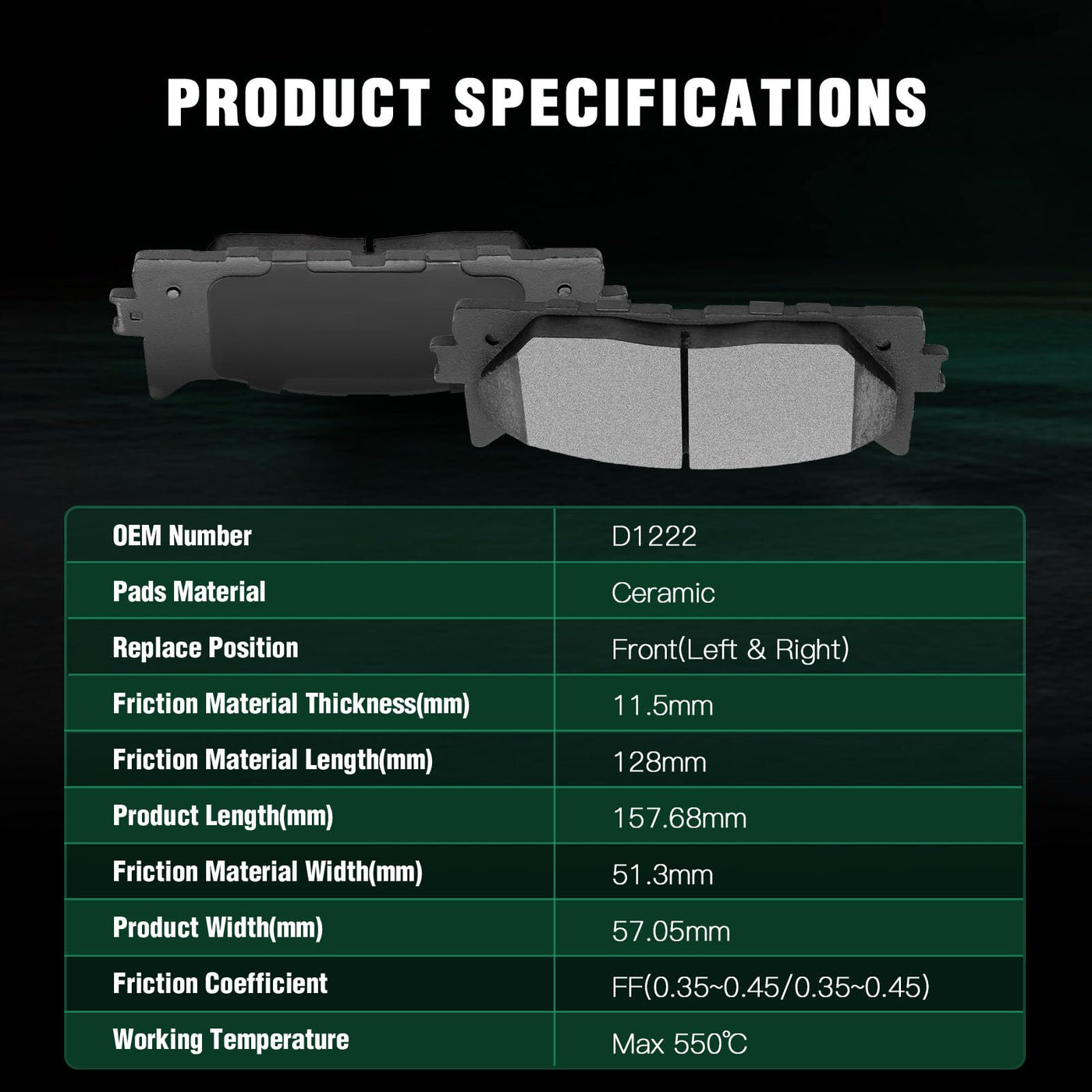 Fits:2007-2018 For Lexus ES350 3.5L2008-2018 For Toyota Avalon 3.5L2007-2009 For Toyota For Camry 2.4L2010-2017 For Toyota For Camry 2.5L2007-2017 For Toyota For Camry 3.5LSpecifications:1)Placement on Vehicle:Front & Rear2)Brake Pad Material:Ceramic-Front Left and RightCeramic-Rear Left and Right3)OEM Part Numbers:ATD1222C,D1222-8331-Front Left and Right308.12120,EHT1212H,D1212-8332-Rear Left and RightPackage Including:8*Ceramic Disc Brake Pads Set