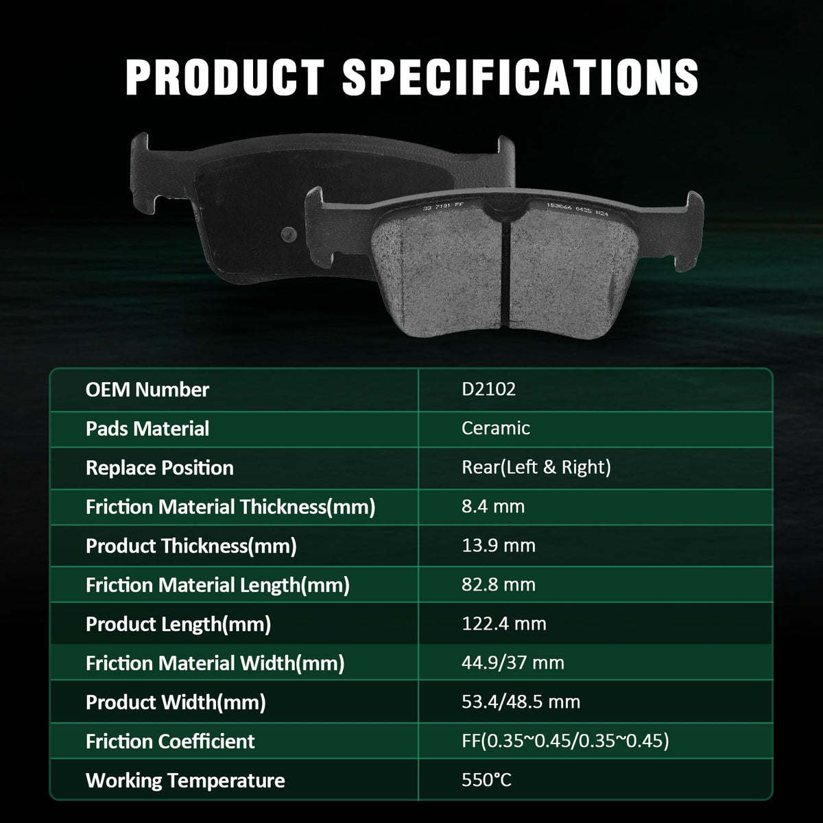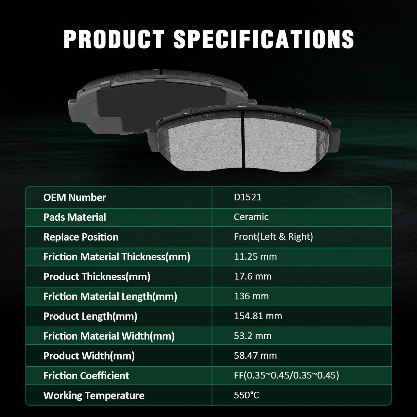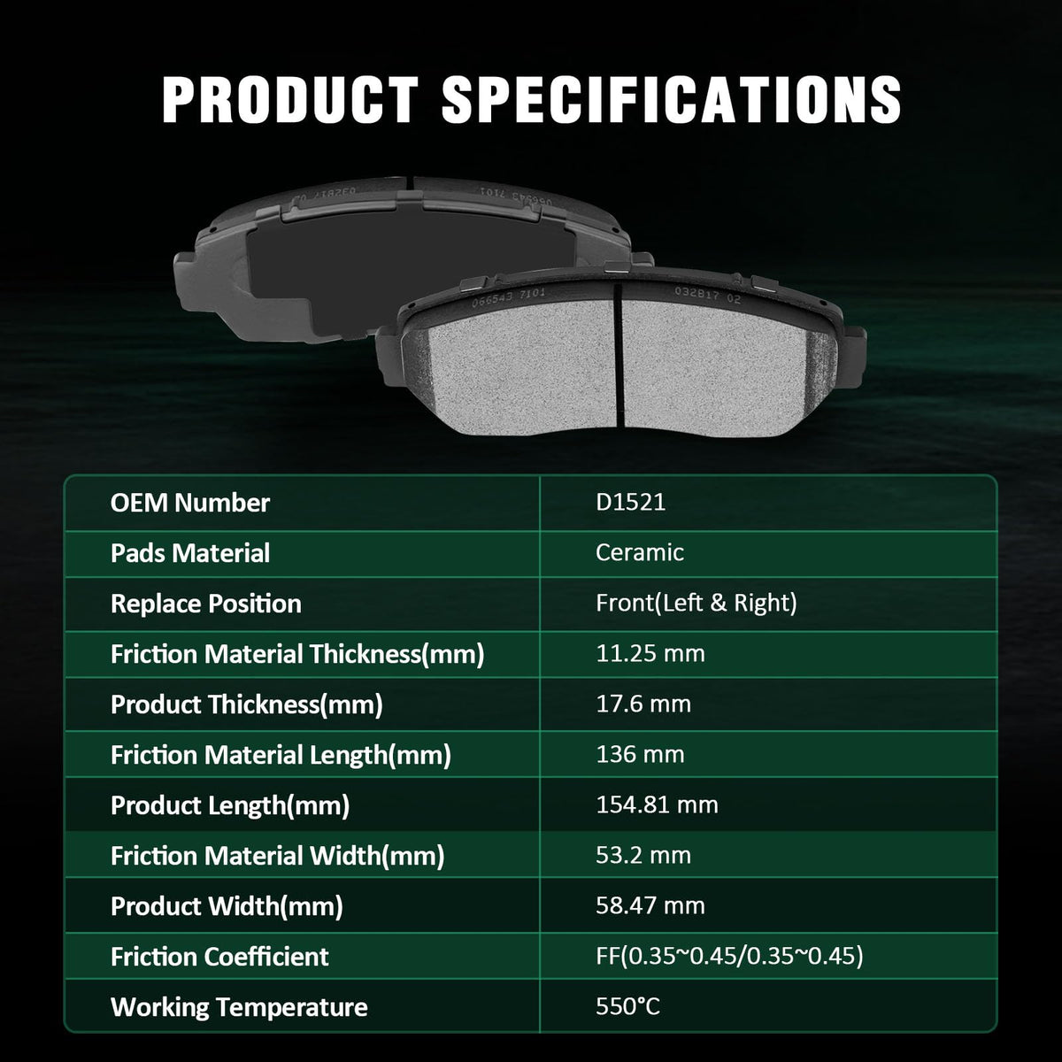 Fits:For Acura TLX Advance Sedan 4-Door 2021-2023For Acura TLX Base Sedan 4-Door 2021-2023For Acura TLX SH-AWD Sedan 4-Door 2021-2023Specifications:1)Placement on Vehicle:Front & Rear2)Brake Pad Material:Ceramic-Front Left & RightCeramic-Rear Left & Right3)OEM Part Numbers:308.15210,EHT1521H,D1521-7994-Front Left & RightD2102-9106-Rear Left & RightPackage Including:8*Ceramic Disc Brake Pads Set