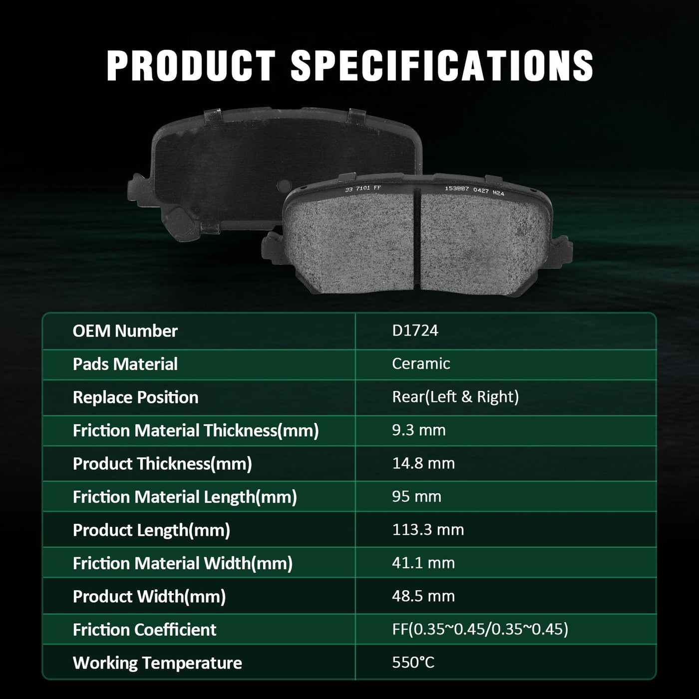 Fits:For Acura MDX 2014-2016For Honda Pilot 2016-2021For Honda Ridgeline 2017-2020Specifications:1)Placement on Vehicle:Front & Rear2)Brake Pad Material:Ceramic-Front Left & RightCeramic-Rear Left & Right3)OEM Part Numbers:D1723-8396-Front Left & RightD1724-8397-Rear Left & RightPackage Including:8*Ceramic Disc Brake Pads Set