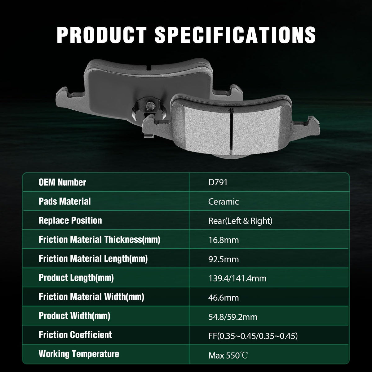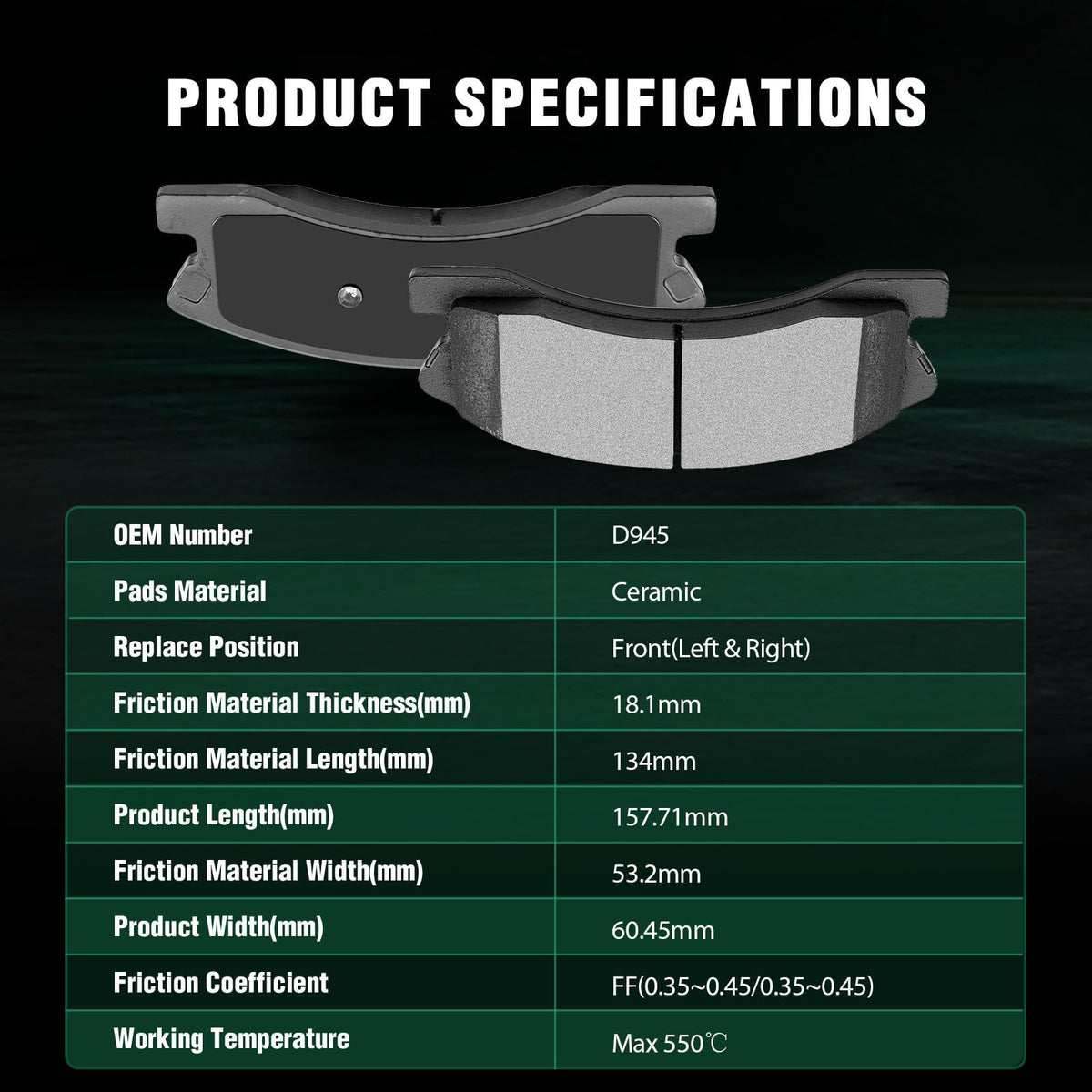 Fits:1999-2004 For Jeep Grand Cherokee 4.0L1999-2004 For Jeep Grand Cherokee 4.7LSpecifications:1)Placement on Vehicle:Front & Rear2)Brake Pad Material:Ceramic-Front Left and RightCeramic-Rear Left and Right3)OEM Part Numbers:ATD945C,D945-7846-Front Left and RightATD791C,D791-7661-Rear Left and RightPackage Including:8*Ceramic Disc Brake Pads Set