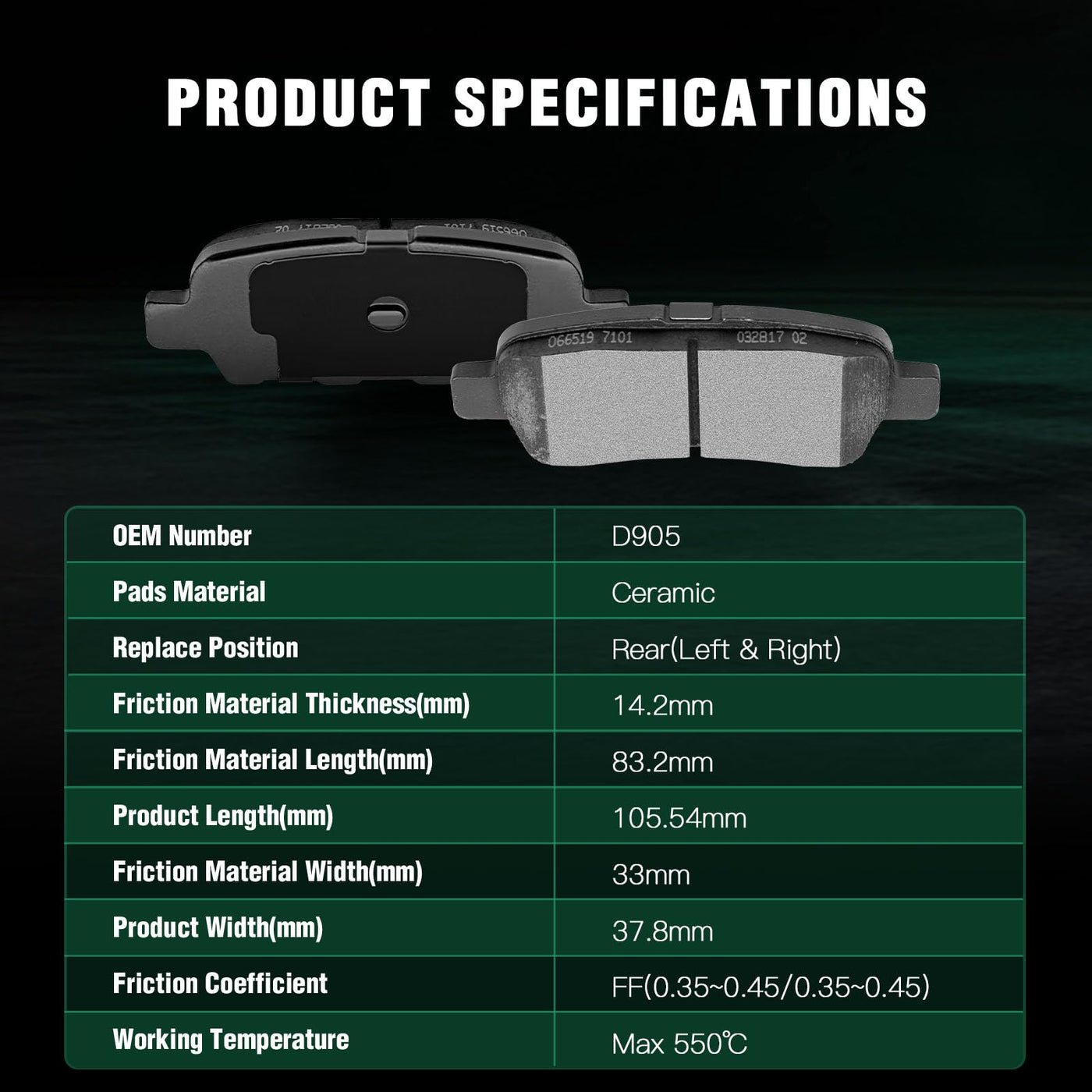 Fits:2003-2005 For INFINITI FX35 3.5L2003-2005 For INFINITI FX45 4.5L2005-2006 For Nissan Altima 3.5L2004-2008 For Nissan Maxima 3.5L2003-2007 2009-2012 For Nissan Murano 3.5LSpecifications:1)Placement on Vehicle:Front & Rear2)Brake Pad Material:Ceramic-Rear Left and RightCeramic-Front Left and Right3)OEM Part Numbers:ATD905C,D905-7784-Rear Left and RightATD969C,D969-7870-Front Left and RightPackage Including:8*Ceramic Disc Brake Pads Set