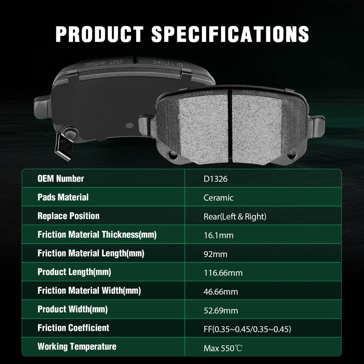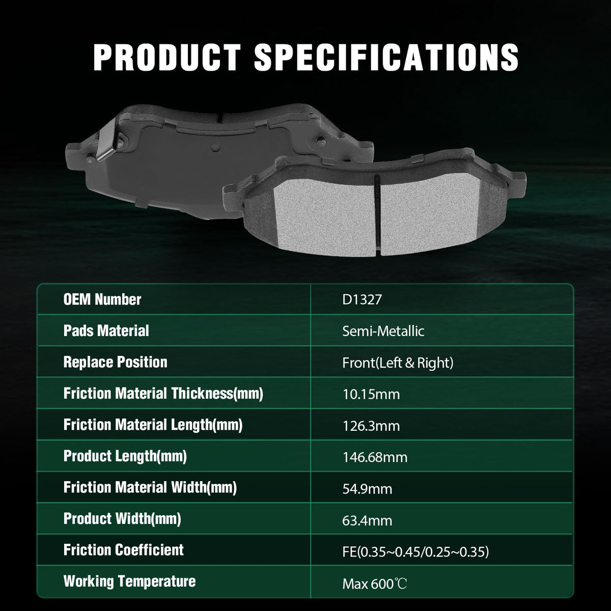 Fits:2008-2010 For Chrysler Town & Country 3.3L2011-2012 For Chrysler Town & Country 3.6L2008-2010 For Chrysler Town & Country 3.8L2008-2010 For Chrysler Town & Country 4.0L2008-2010 For Dodge Grand Caravan 3.3L2011-2012 For Dodge Grand Caravan 3.6L2008-2010 For Dodge Grand Caravan 3.8L2008-2010 For Dodge Grand Caravan 4.0L2009-2012 For Dodge Journey 2.4L2009-2010 For Dodge Journey 3.5L2011-2012 For Dodge Journey 3.6L2011-2012 For Volkswagen For Routan 3.6L2009-2010 For Volkswagen For Routan 3.8L2009-2010 For Volkswagen For Routan 4.0LSpecifications:1)Placement on Vehicle:Front & Rear2)Brake Pad Material:Semi-Metallic-Front Left and RightCeramic-Rear Left and Right3)OEM Part Numbers:D1327-8439,ATD1327C-Front Left and RightATD1326C,D1326-8438-Rear Left and RightPackage Including:8*Disc Brake Pads Set