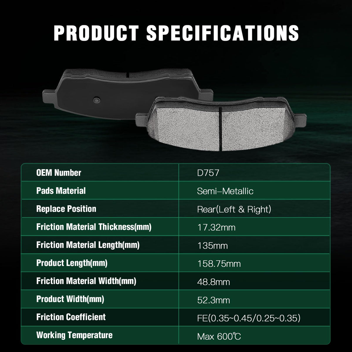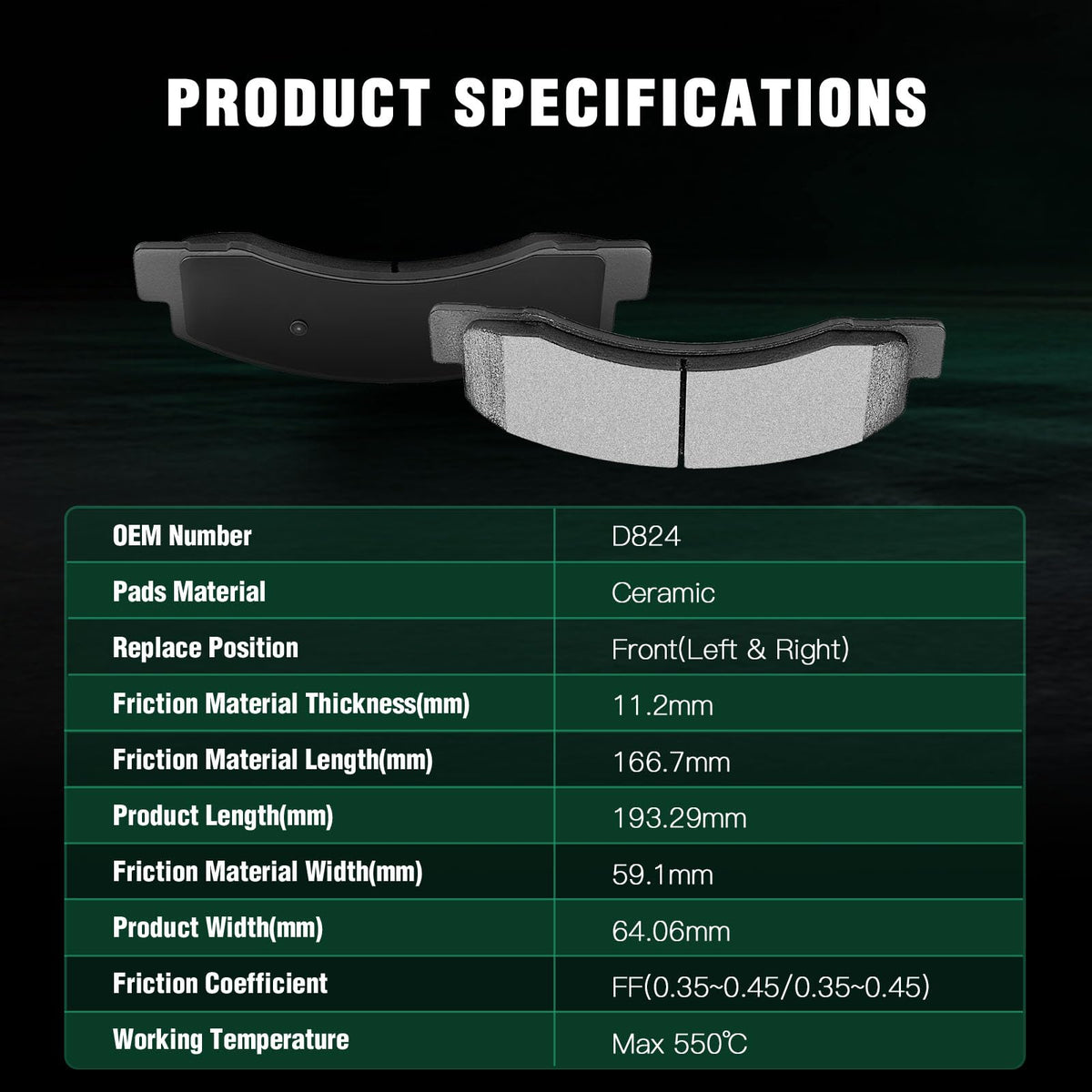 Fits:2000-2005 For Ford For Excursion 5.4L2003-2005 For Ford For Excursion 6.0L2000-2005 For Ford For Excursion 6.8L2000-2003 For Ford For Excursion 7.3L1999-2004 For Ford For F-250 Super Duty 5.4L2003-2004 For Ford For F-250 Super Duty 6.0L1999-2004 For Ford For F-250 Super Duty 6.8L1999-2003 For Ford For F-250 Super Duty 7.3L1999-2004 For Ford For F-350 Super Duty 5.4L2003-2004 For Ford For F-350 Super Duty 6.0L1999-2004 For Ford For F-350 Super Duty 6.8L1999-2003 For Ford For F-350 Super Duty 7.3LSpecifications:1)Placement on Vehicle:Front & Rear2)Brake Pad Material:Ceramic-Front Left and RightSemi-Metallic-Rear Left and Right3)OEM Part Numbers:ATD824C,D824-7625-Front Left and RightATD757C,D757-7626-Rear Left and RightPackage Including:8*Disc Brake Pads Set