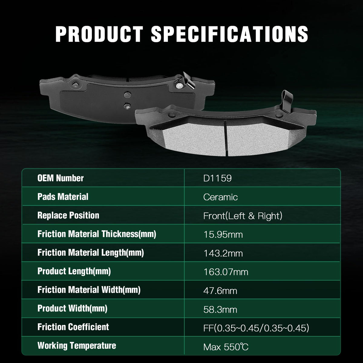 Fits:2009 For Buick Allure 3.8L2009 For Buick LaCrosse 3.8L2011 For Chevrolet Impala 3.5L2012-2013 For Chevrolet Impala 3.6L2011 For Chevrolet Impala 3.9L2014-2016 For Chevrolet Impala Limited 3.6LSpecifications:1)Placement on Vehicle:Front & Rear2)Brake Pad Material:Ceramic-Front Left and RightSemi-Metallic-Rear Left and Right3)OEM Part Numbers:ATD1159C,D1159-8269-Front Left and RightD999-7900-Rear Left and RightPackage Including:8*Disc Brake Pads Set