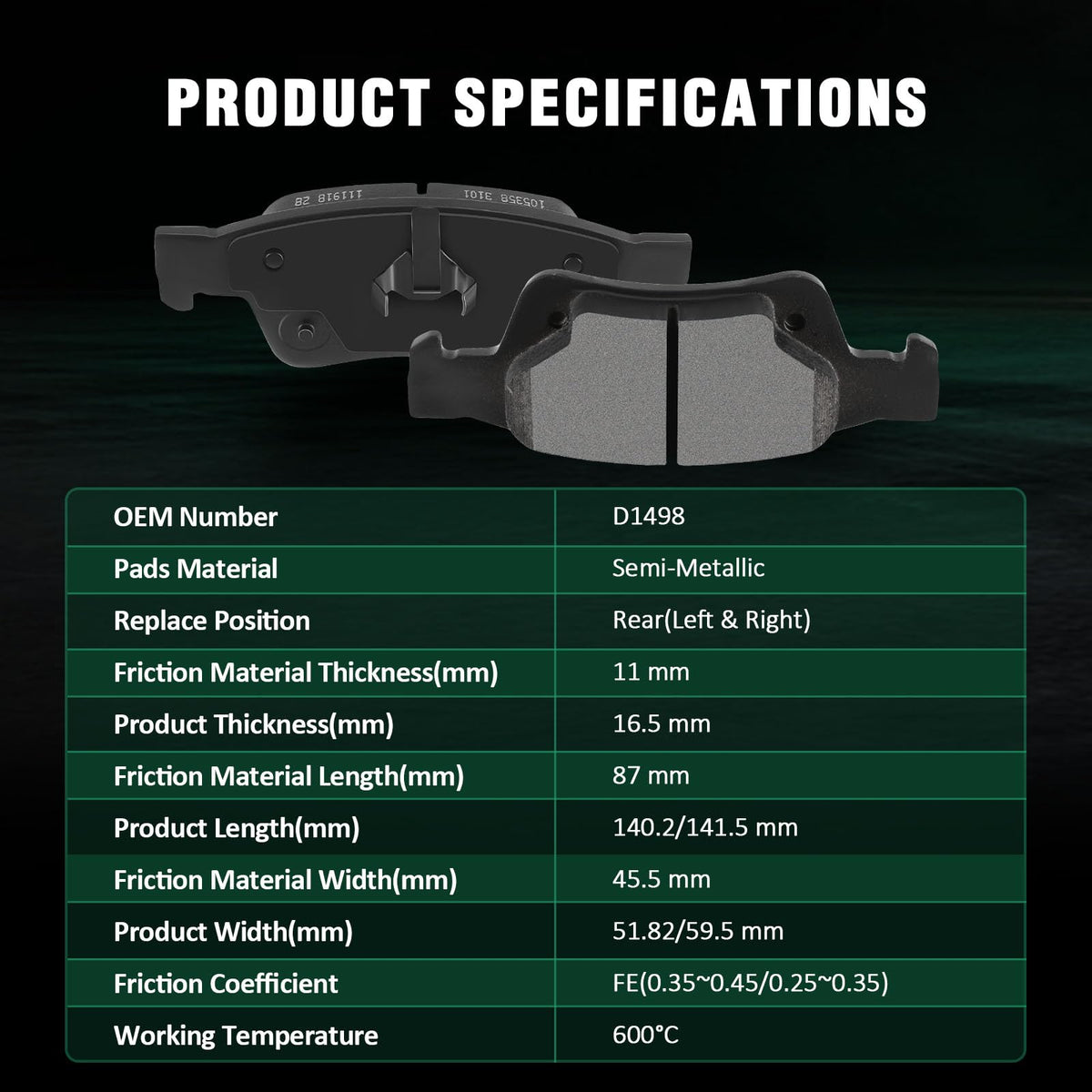 Fits:For Dodge For Durango 2011-2022For Jeep Grand Cherokee 2011-2021For Jeep Grand Cherokee WK 2022Specifications:1)Placement on Vehicle:Front & Rear2)Brake Pad Material:Metallic-Front Left & RightSemi-Metallic-Rear Left & Right3)OEM Part Numbers:D1904-8856-Front Left & RightD1498-8698-Rear Left & RightPackage Including:8*Metallic/Semi-Metallic Disc Brake Pads Set