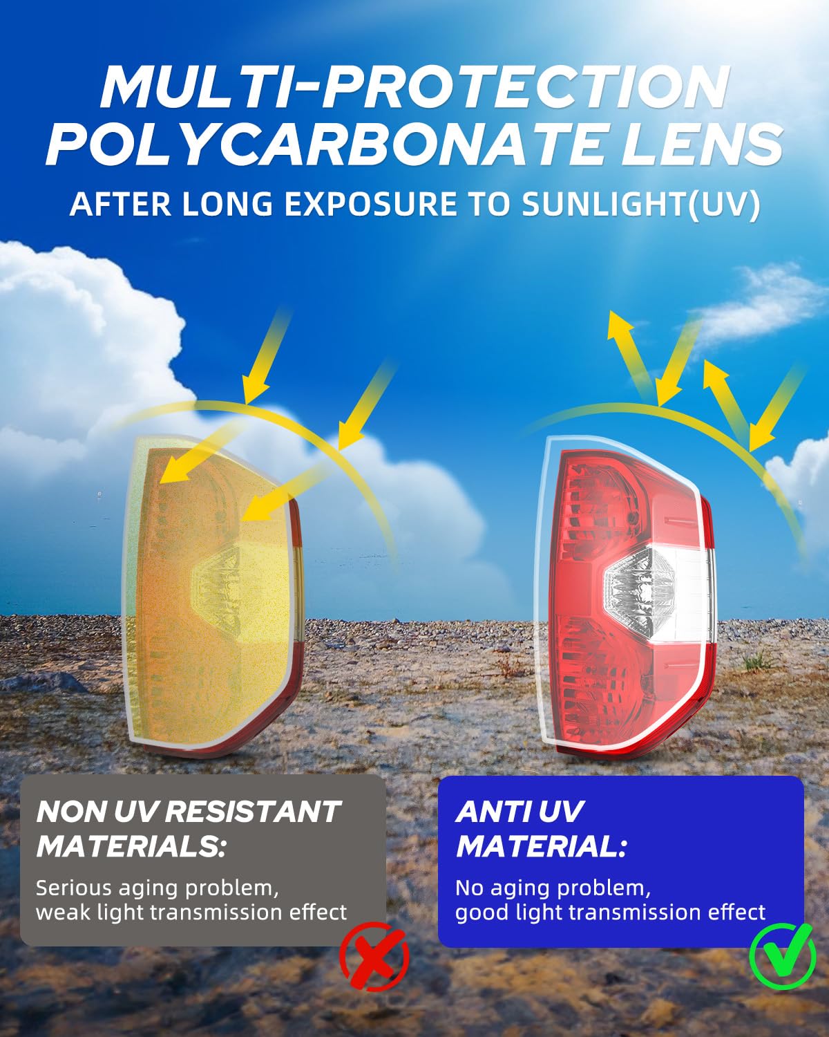 Q: What materials are used in the construction of the AUTOONE Tundra Tail Light Assembly?A: The AUTOONE Tundra Tail Light Assembly is made from high-strength ABS plastic and anti-UV PC lens, providing exceptional impact resistance and long-lasting durability against various weather conditions.