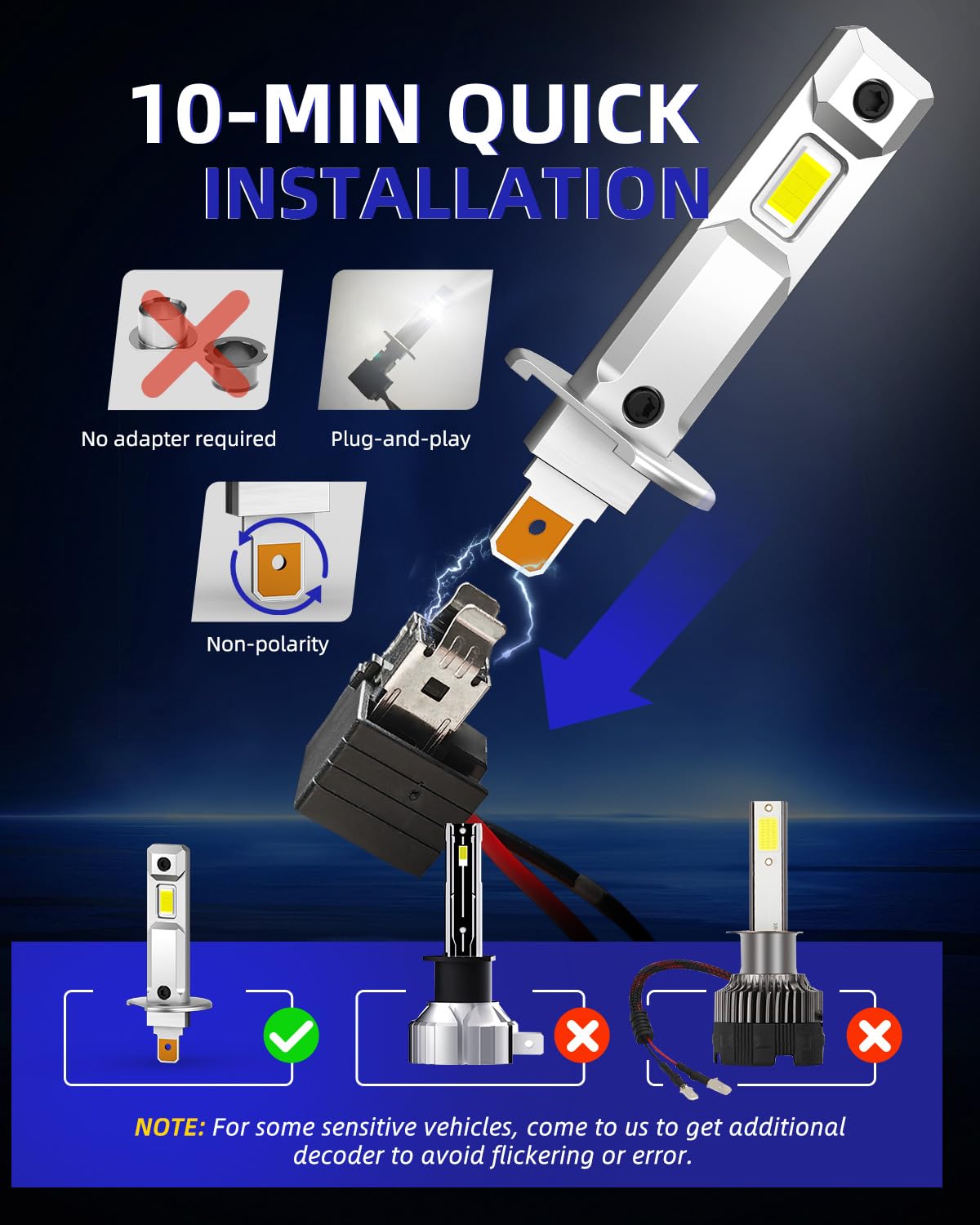 Autoone H1 Led Light Bulb, 400% Super Brighter 1:1 Halogen Size, 6500K White Fog Bulbs, Plug And Play, Pack Of 2