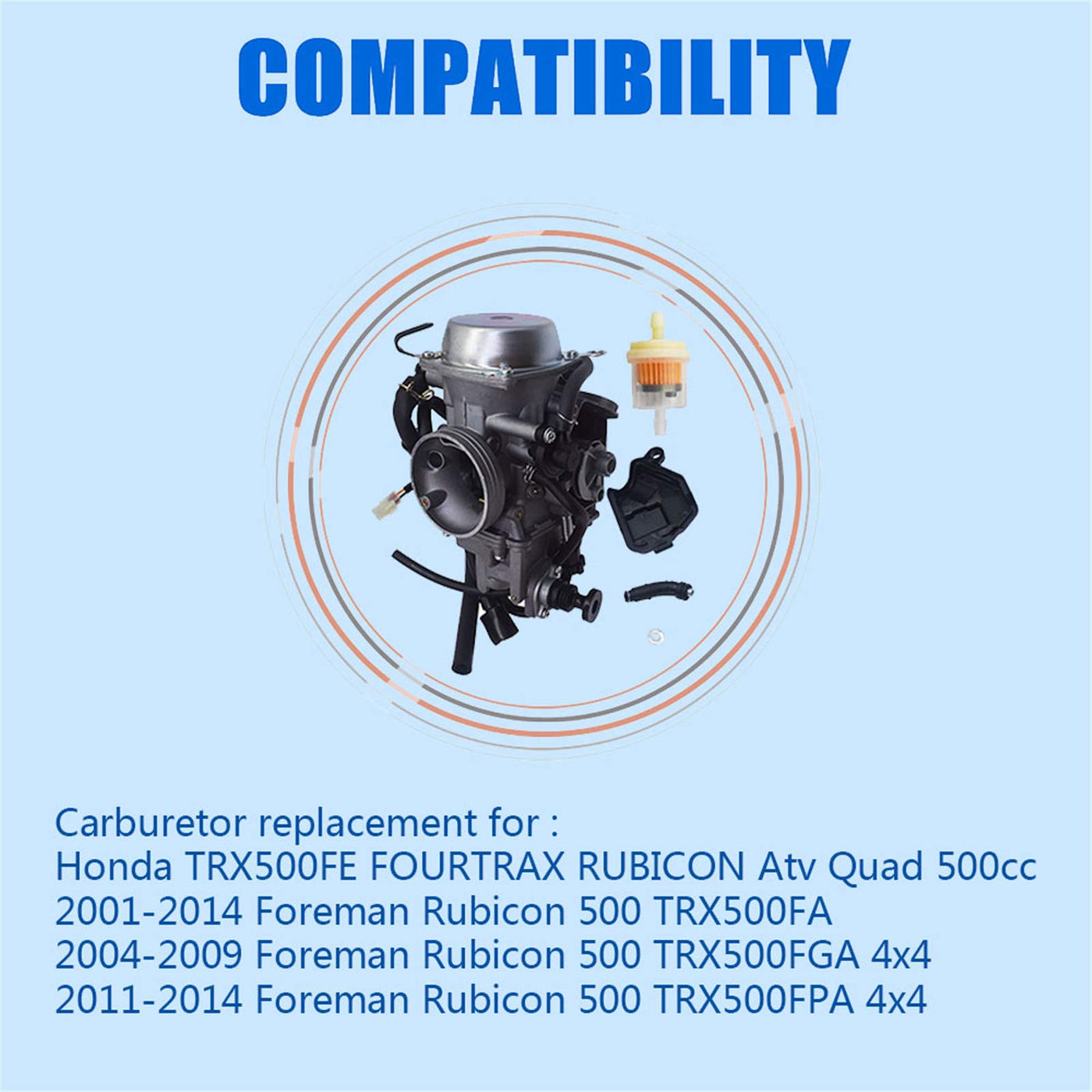 Q: What Honda ATV models are compatible with the Autoparts Carburetor Carb?A: The Autoparts Carburetor Carb is compatible with several Honda ATV models, specifically the 2001-2014 Foreman Rubicon 500 TRX500FA, 2004-2009 Foreman Rubicon 500 TRX500FGA 4x4, and 2011-2014 Foreman Rubicon 500 TRX500FPA 4x4.