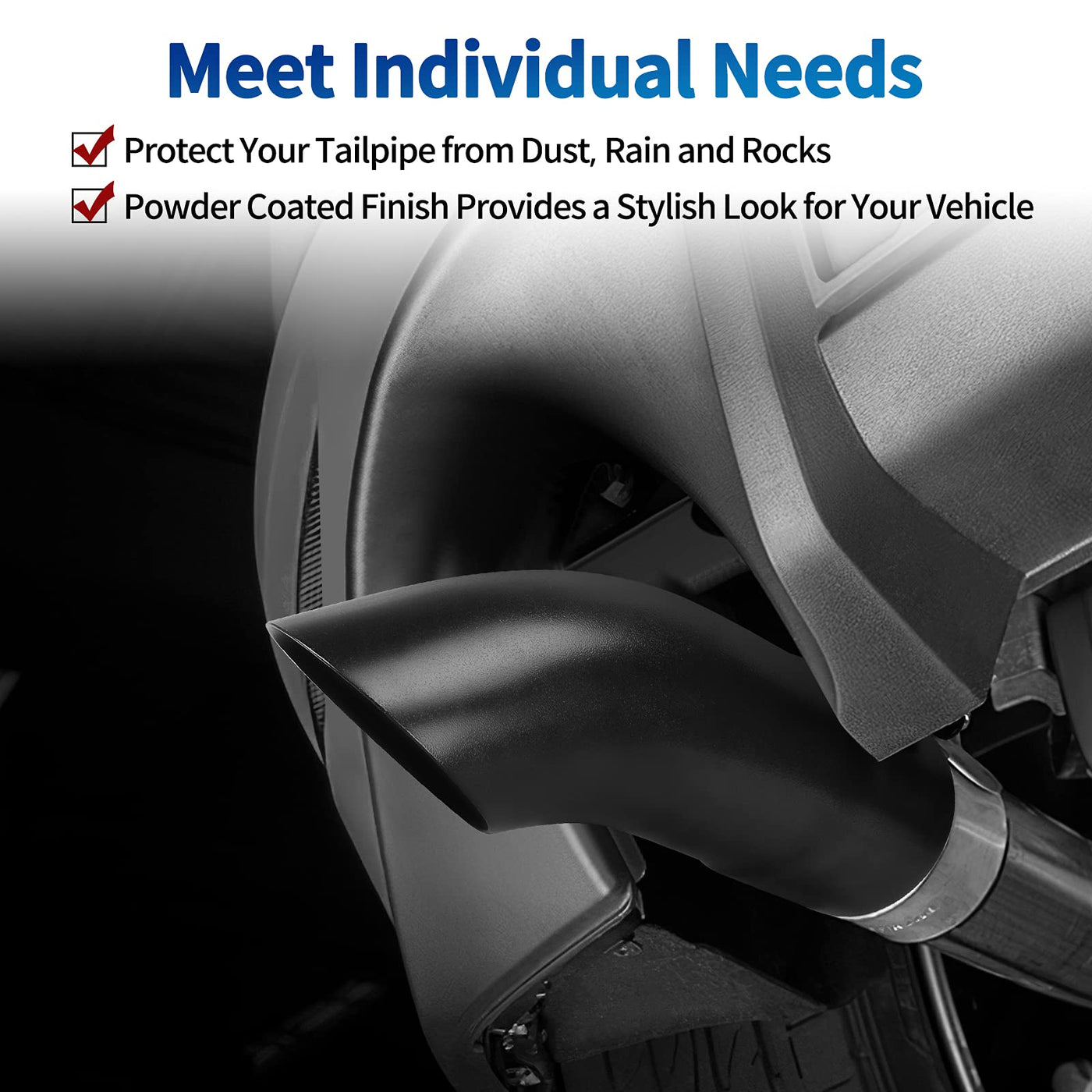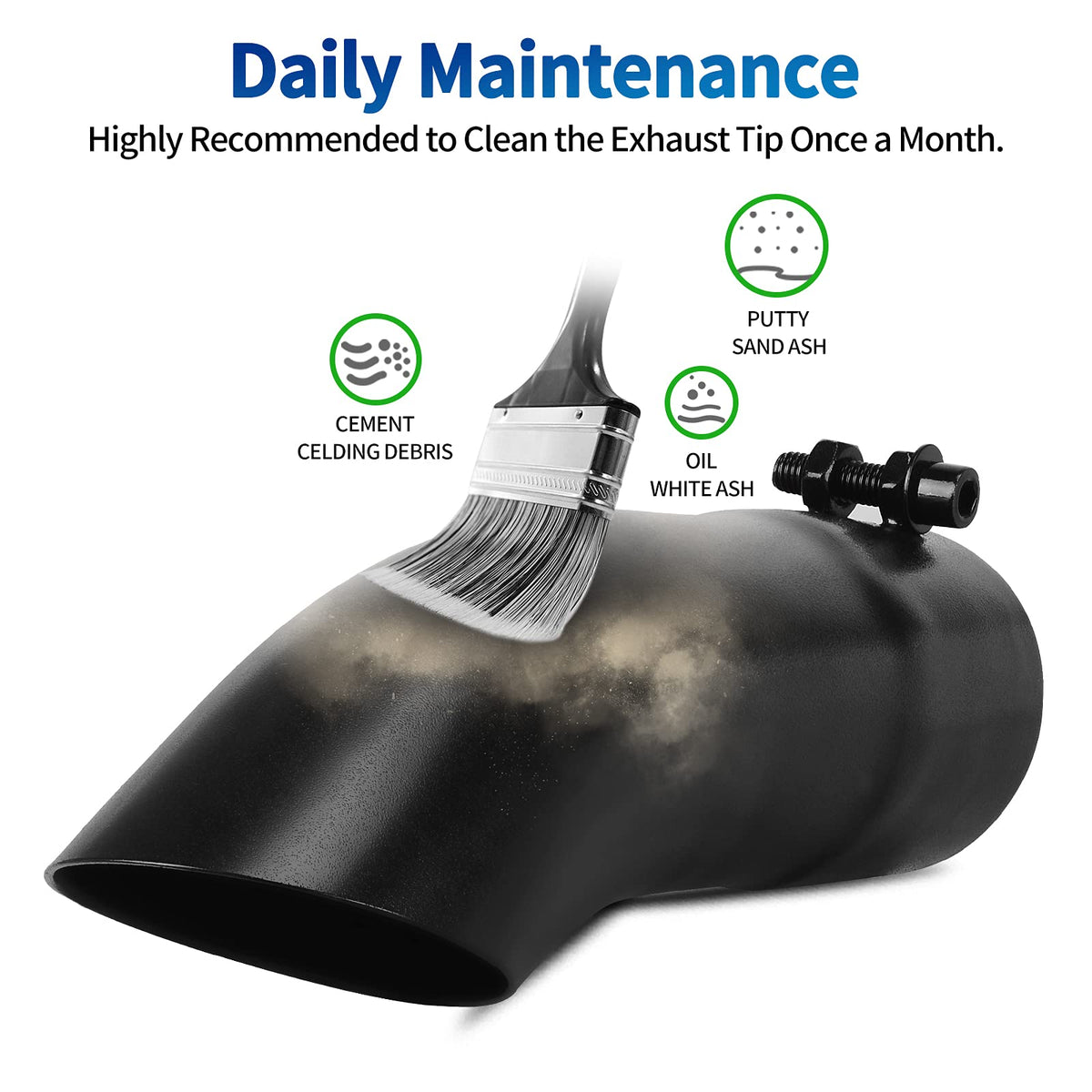 Dimension: standard 2.25'' x 2.25'' x 9''(inlet, outlet, and overall length); ONLY universal fit for vehicles with 2.25-inch outlet diameter exhaust pipes ( Please make sure the outlet outer diameter of your vehicle tailpipe is 2.25'' before purchase) | Anti-deformation & rustproof: built from high-grade stainless steel, our exhaust tips perfectly decorate your tailpipe system & effectively resist heat, rust and deformation for enhanced durability; plus, the functional turn down angle cut design helps drain water and dust | Stylish & pleasant-sounding: the black coated finish would decorate your car with an elegant & mysterious appeal; meanwhile, the thicker inner wall design make your car sounds rumble and crackle for a more powerful and unique sound | Easy installation: the bolt/ clamp-on design makes it super easy to fasten to your exhaust pipe with M6 Allen key, no drilling or welding needed | Daily Maintenance: To make this exhaust tip has a long-life service - Please Sweep away the welding debris, cement, oil, white ash, putty, sand ash regularly to keep the surface clean. We recommend to do above action once a month (NOTE: Professional installation would be highly recommended)