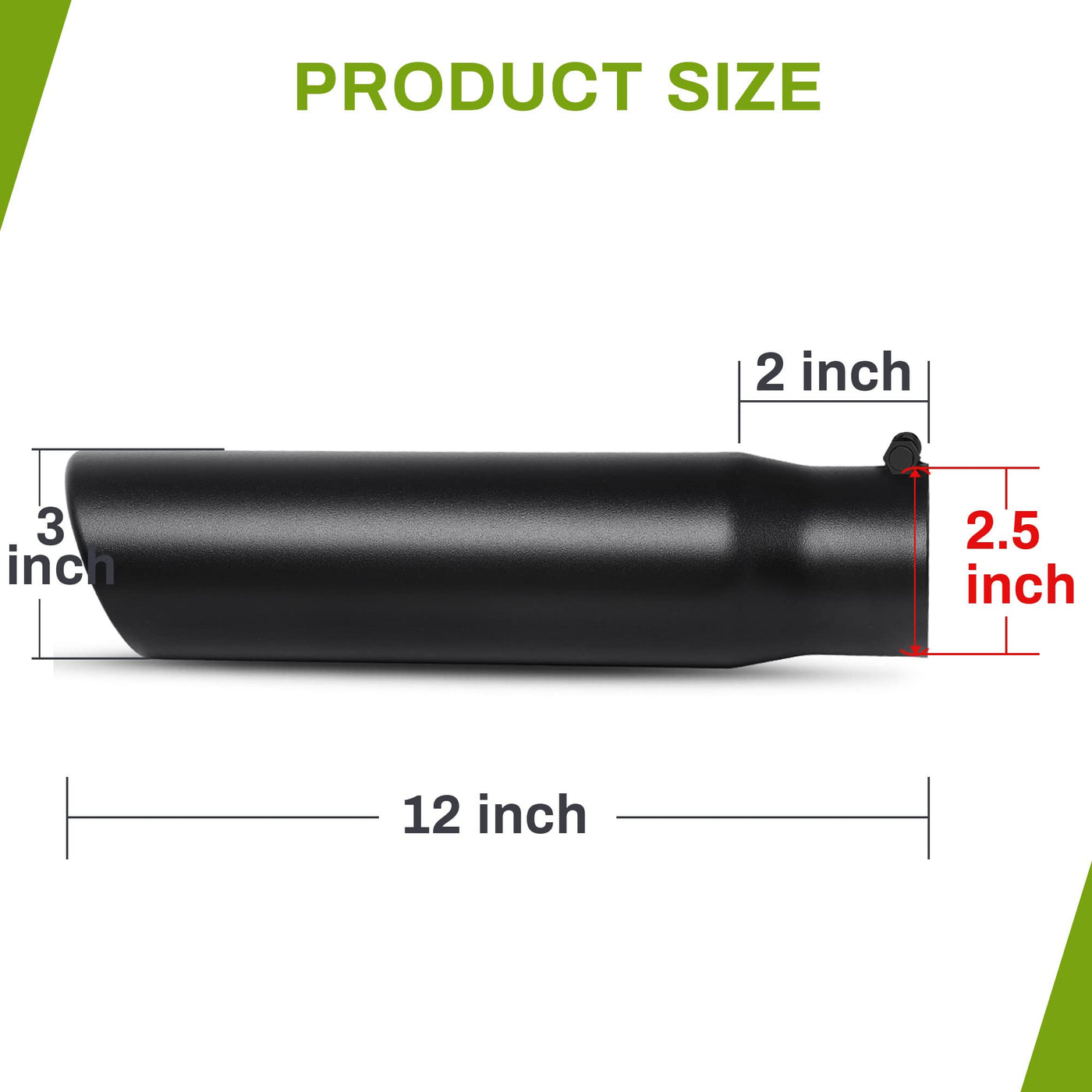Installation Steps: Step 1: Clean the surface of your tailpipe. Clean the dirt and sand on your tailpipe with penetrating oil and a shop rag. (Make sure your tailpipe is at room temperature, and do not clean the surface of the tailpipe after the car just went out). Step 2: Slide the exhaust tip into your tailpipe. Try to slide the exhaust tip into the tailpipe. You may encounter some resistance, so, if necessary, use automotive grease to lubricate the pieces. Cover the end of the exhaust tip with a towel and tap it into a place with a rubber mallet. Step 3: Fasten/weld the exhaust tip. Tighten screws and clamps to secure the exhaust tips. Should you worry that it is not tight enough, you can weld a joint between the edges of the tailpipe and the exhaust tip. Then, the installation is complete. Protect the Original Tailpipe: Protect the original exhaust pipe from sun and rain to prevent rusting and deformation. Nice Looking: The black painting finish, elegant and mysterious, perfectly decorates the tailpipe of your car. Specification: Inlet Size: 2.5 Inch Inside Diameter Outlet Size: 3 Inch Outer Diameter Length: 12 Inch Overall Length Material: Black Paint Finish Stainless Steel Package: 1 piece exhaust tip. Note: Please measure the size of your exhaust pipe prior to purchase of this exhaust tip. Click ''Add to Cart'', Take the Cool Exhaust tip Home !!!