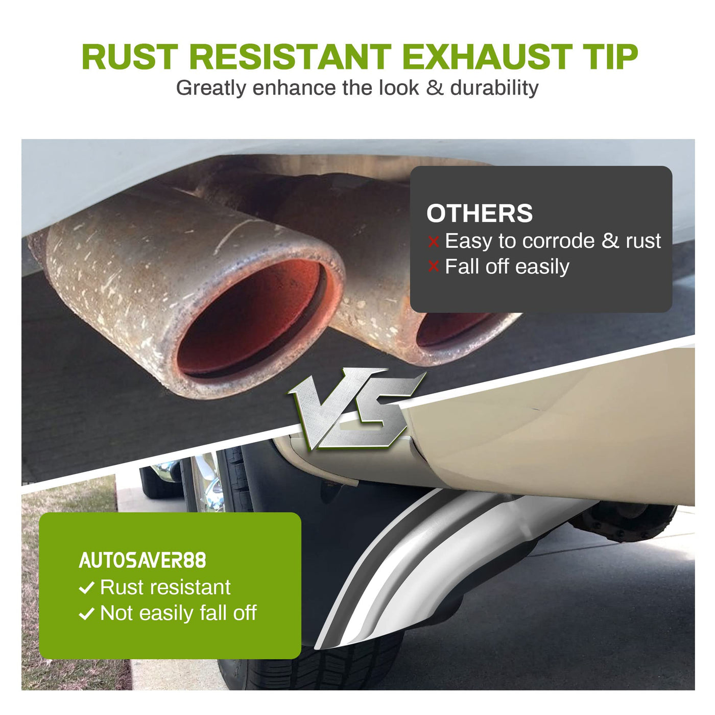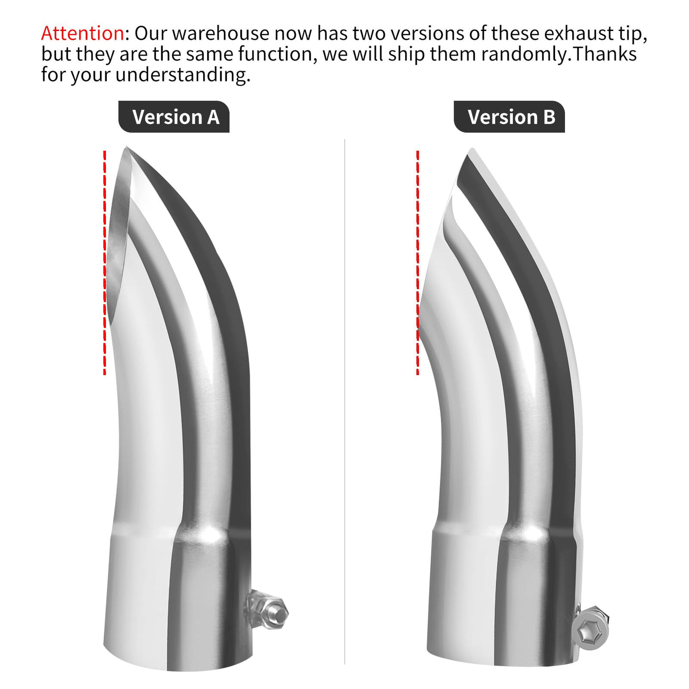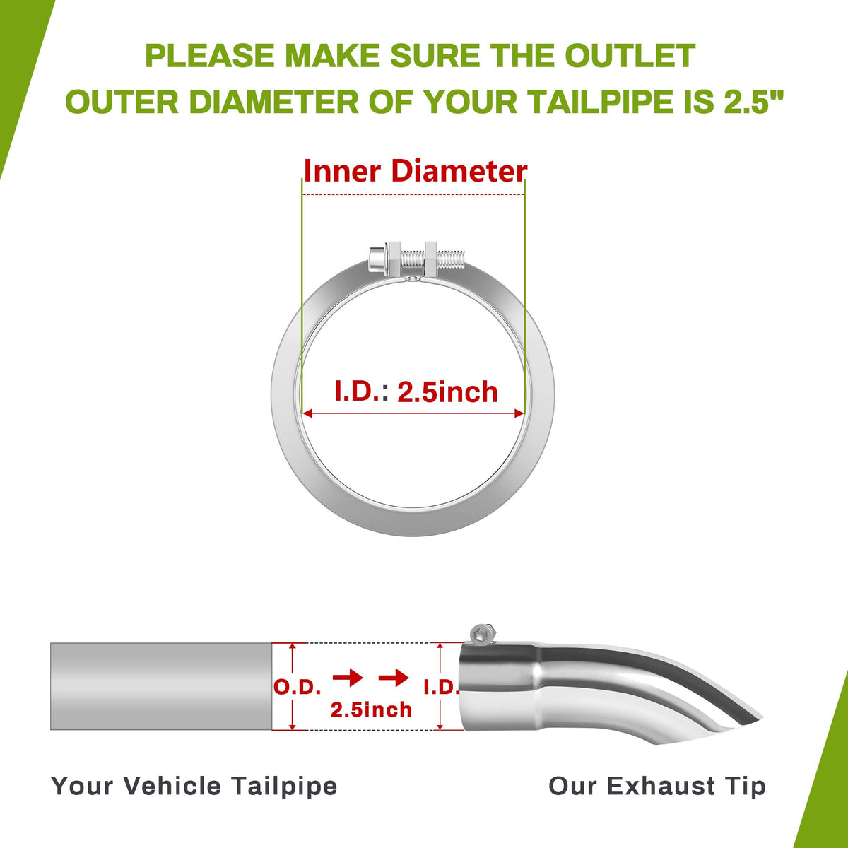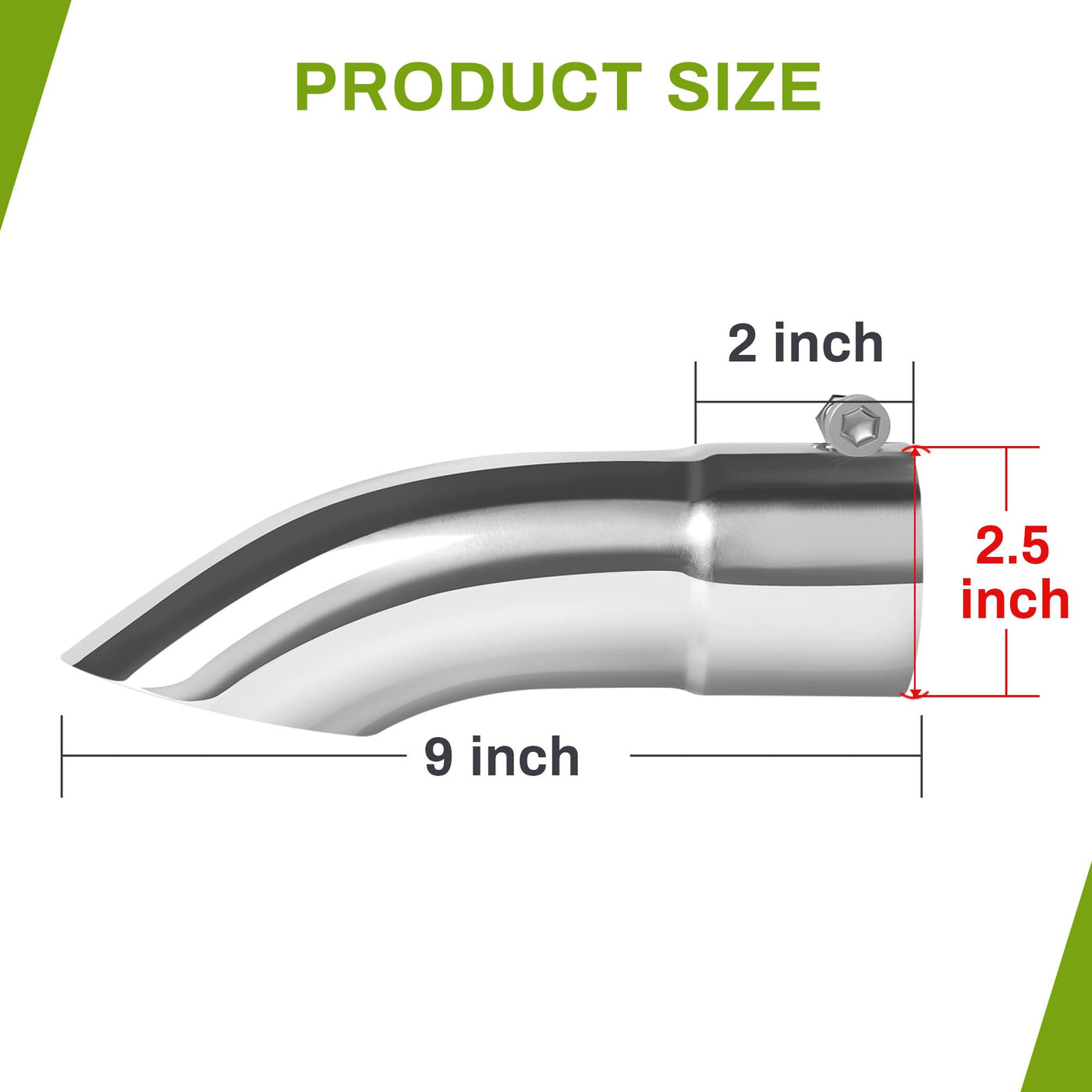 Dimension: Standard 2.5'' x 2.5'' x 9''(inlet, outlet, overall length); ONLY fits vehicles with 2.5-inch outside diameter exhaust tailpipe, no matter what the model is ( please measure and make sure the Outside Diameter of your car tailpipe is 2.5'' before purchase) | Anti-deformation & rustproof: Built from high-grade stainless steel, our chrome-plated exhaust tips effectively resist heat, rust and deformation to protect & decorate your tailpipe system well; plus, a turndown design helps drain water to prevent rust | Stylish & pleasant-sounding: Sleek angle cut and thicker inner wall design, make your car sounds rumble and crackle for a more powerful and unique sound; meanwhile, the polished finish offers your car with a new & shining appeal | Easy installation: The bolt-on design makes it super easy to fasten to your exhaust pipe with M6 Allen key, no drilling or welding needed | Daily Maintenance: To make this exhaust tip has a long-life service - Please Sweep away the welding debris, cement, oil, white ash, putty, sand ash regularly to keep the surface clean. We recommend to do above action once a month (NOTE: Professional installation would be highly recommended)