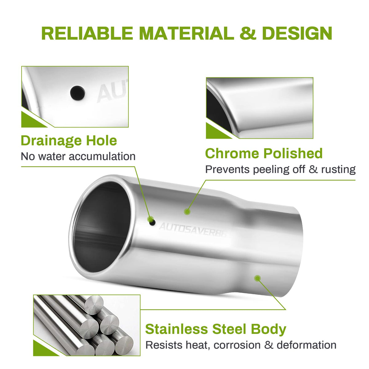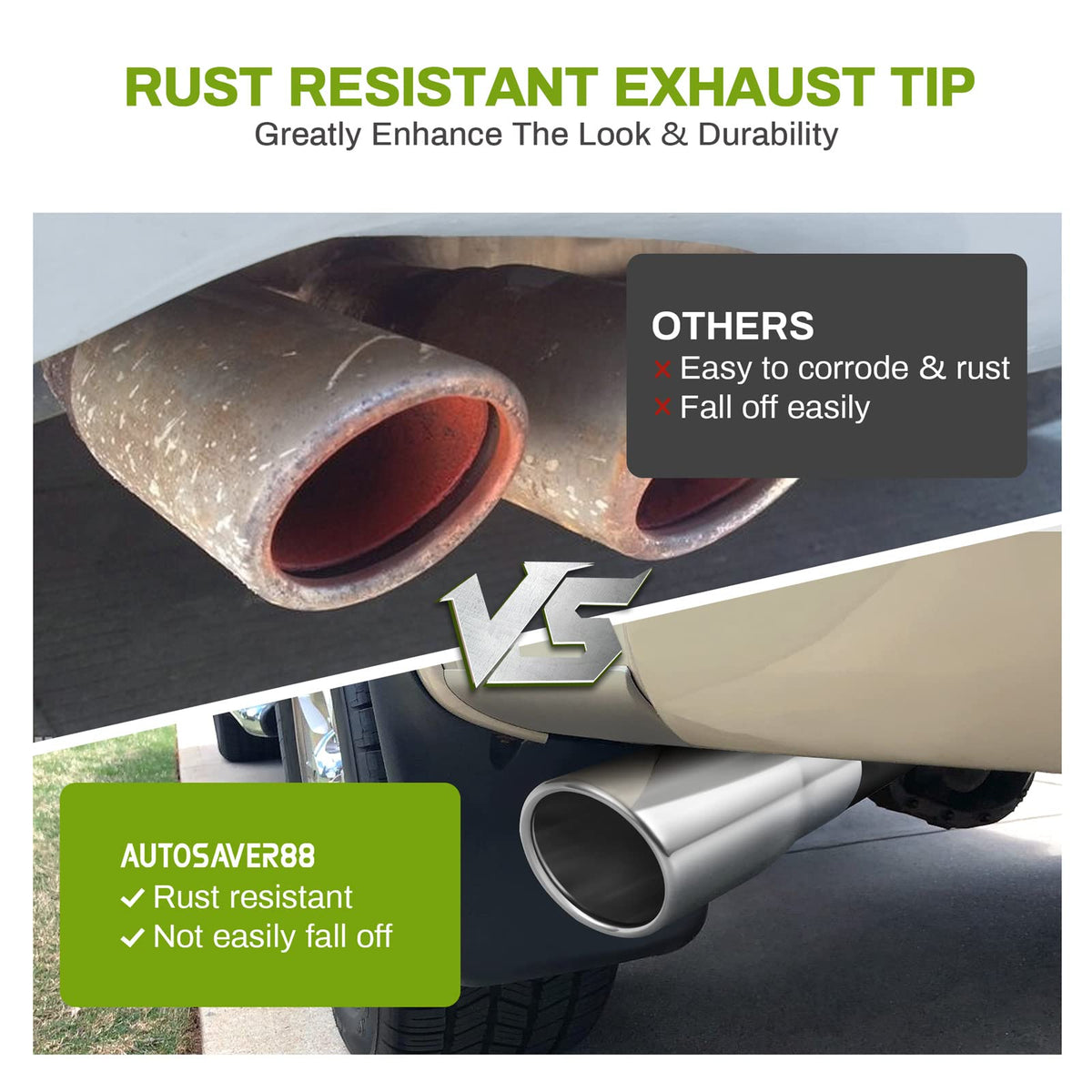 Q: Is the AUTOSAVER88 exhaust tip resistant to rust and deformation?A: Yes, the exhaust tip is made from high-grade stainless steel with a chrome polished finish, which effectively resists heat, rust, and deformation, ensuring durability and longevity.