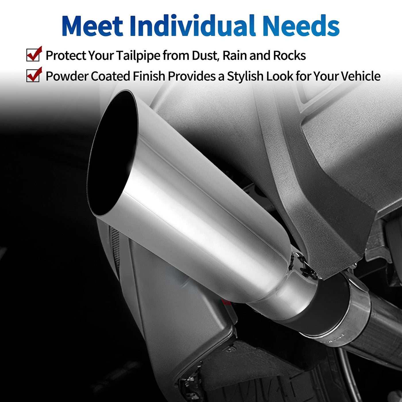 Protect the Original Tailpipe: Protect the original exhaust pipe from sun and rain, avoid rusting and deformation. Nice Looking: Chromed polished finish, bright as a mirror, makes the exhaust tip looks shiny bright, Easy to Install: There is no need to replace any parts, No weld needed. No drill needed. Specification: Inlet Diameter: 2.75 Inch Outlet Diameter: 3.5 Inch Overall Length: 12 Inch Style: Angled Cut - Rolled Edge Material: Chromed Stainless Steel Click ''Add to Cart'', Take the Cool Exhaust tip Home !!!