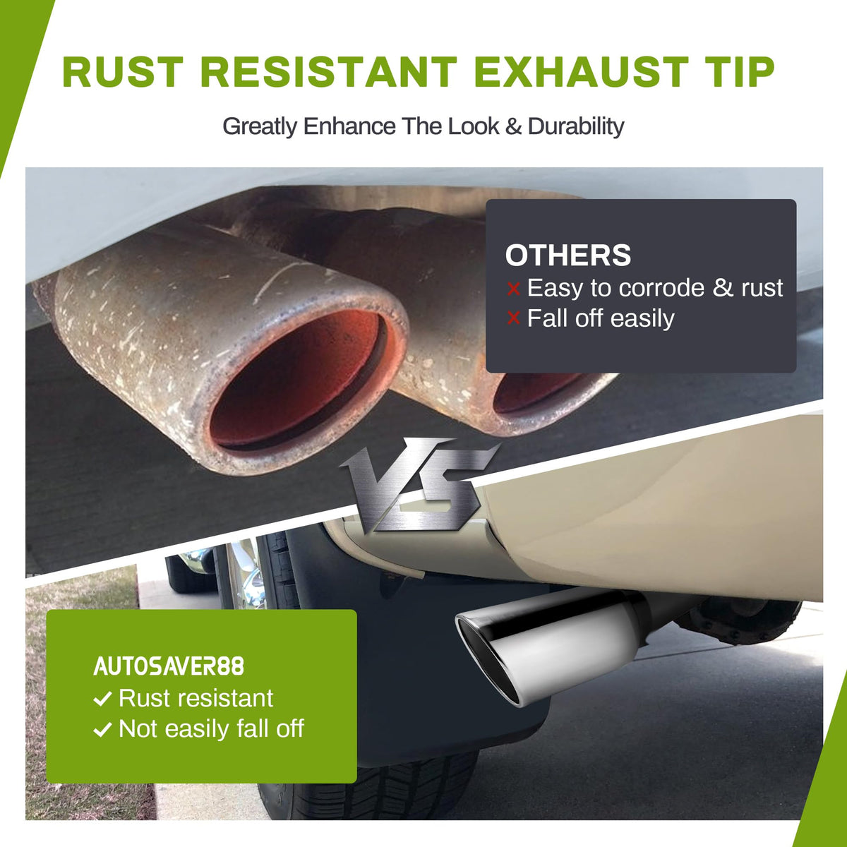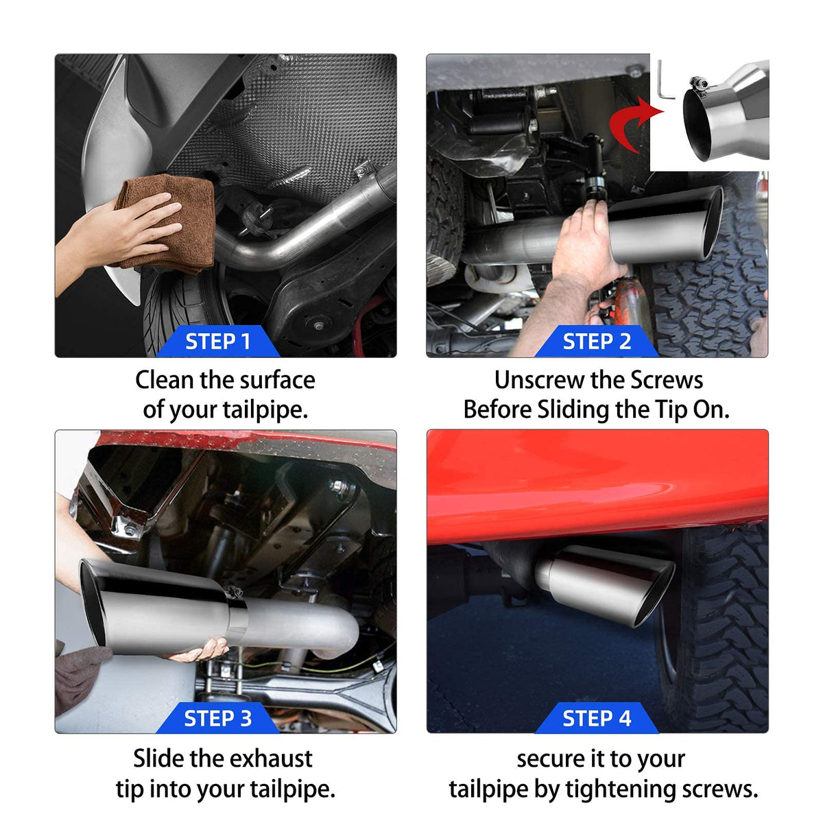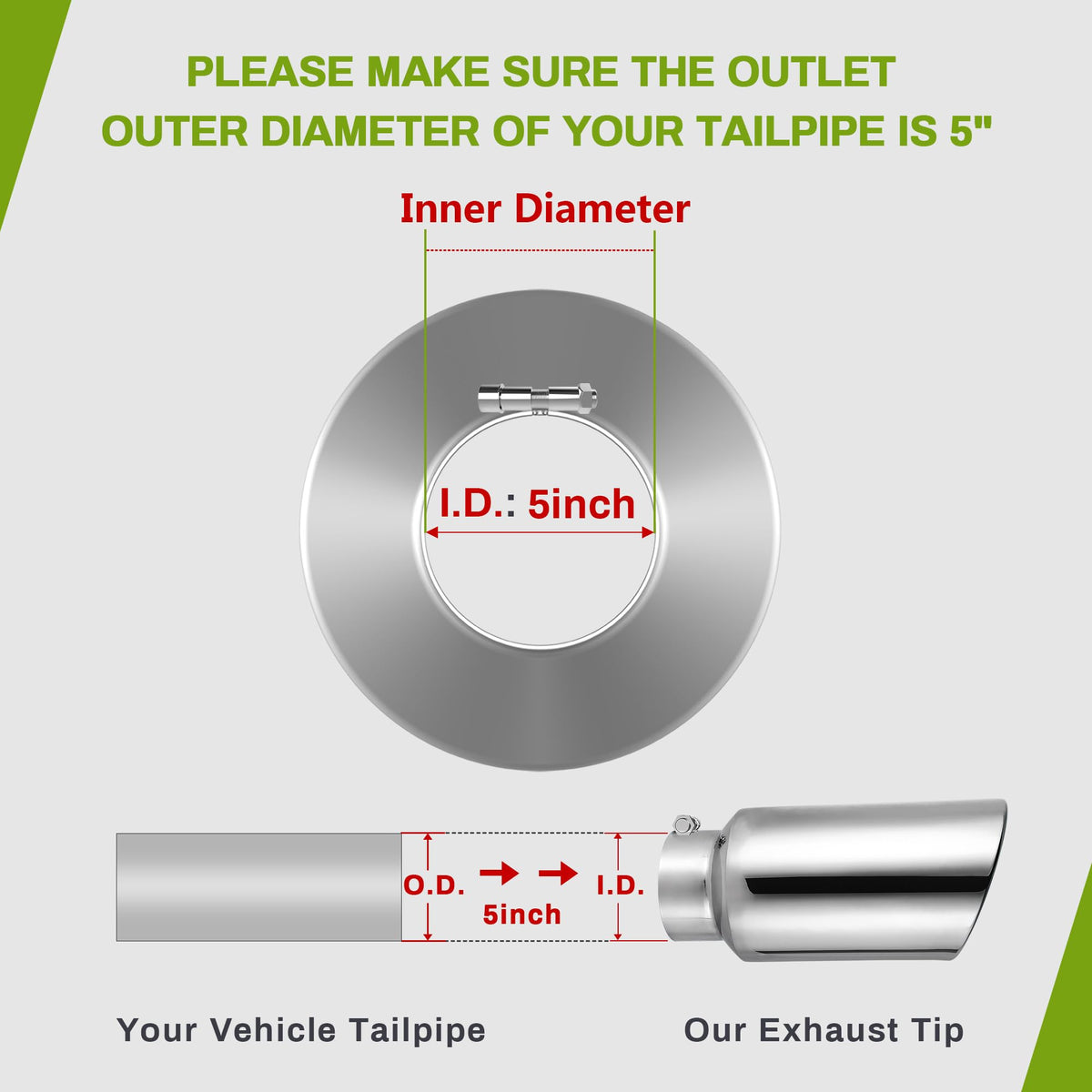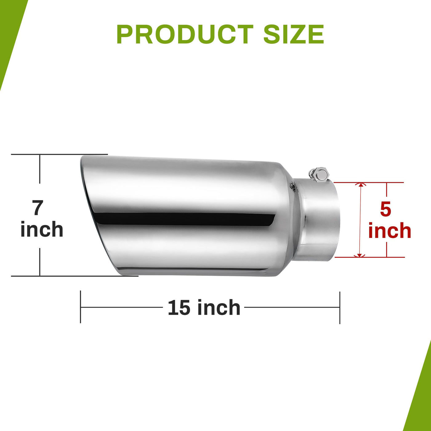 Dimension: standard 5'' x 7'' x 15''(inlet, outlet and overall length); ONLY universal fit for vehicles with 5-inch outside diameter exhaust pipes (Notice: Please make sure the Outside Diameter of your vehicle tailpipe outlet is 5.0'' before purchase) | Anti-deformation & rustproof: built from high-grade stainless steel, our exhaust tips effectively resist heat, rust and deformation to protect & decorate your tailpipe system well; plus, a drainage hole helps drain water to prevent rust | Stylish & pleasant-sounding: sleek degree rolled-edge angle cut and thicker inner wall design, make your car sounds rumble and crackle for a more powerful and unique sound, meanwhile, the chrome-plated and polished finish would make your car tailpipe shine brightly | Easy installation: the bolt-on design makes it super easy to fasten to your exhaust pipe with M8 Allen Key, no drilling or welding needed | Daily Maintenance: To make this exhaust tip has a long-life service - Please Sweep away the welding debris, cement, oil, white ash, putty, sand ash regularly to keep the surface clean. We recommend to do above action once a month (NOTE: Professional installation would be highly recommended)