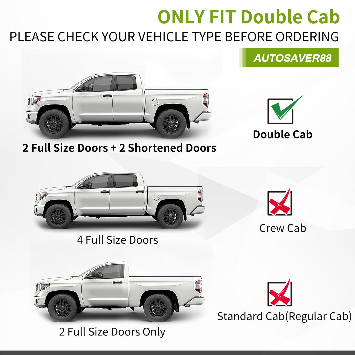 IMPORTANT - This running board side step is compatible with the 2007-2021 Toyota Tundra Double Cab. Please check the Cab Size picture before ordering | PRACTICAL DESIGN - 6 wide stylish black stainless steel pad provides a textured surface for excellent footing. Each side can support up to 450 lb | SUPER QUALITY - The running boards' structure provides strength and durability. The 6-inch non-slip injection step pad allows easy movement such as stepping in, stepping out, and even jumping (450 lb. capacity) | SUPREME FUNCTIONALITY - Made from Stainless Steel and pre-treated with rust-resistant powder coatings. One-piece design ensures excellent performance and looks for years to come | EASY TO INSTALL - Easy bolt-on installation with no drilling required. All factory holes are perfectly aligned with the mounts; bolts to factory mount in less than an hour