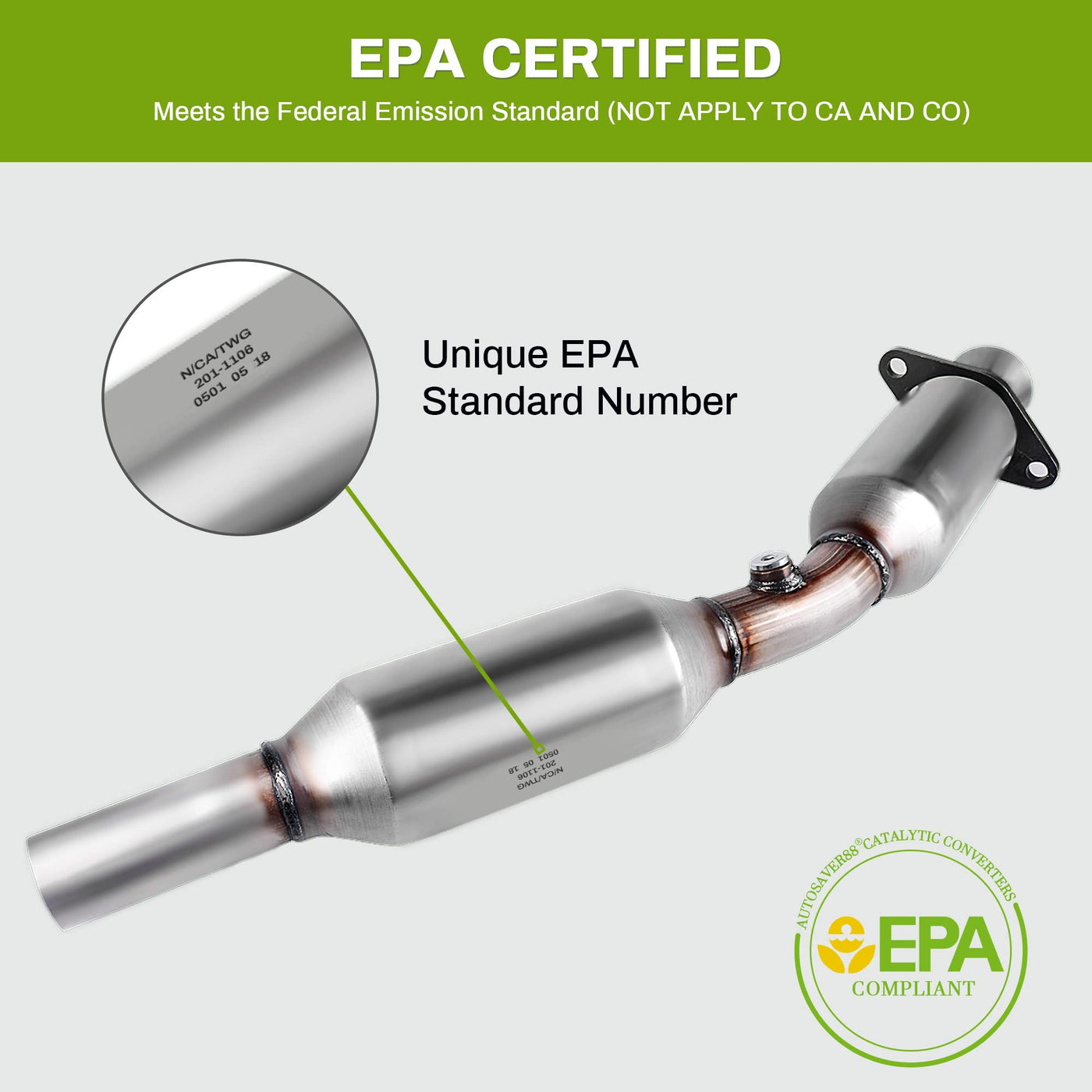 Q: Does this catalytic converter meet EPA standards?A: Yes, this catalytic converter is EPA certified and comes with an exclusive EPA number stamped on the shell, ensuring compliance with federal standards.