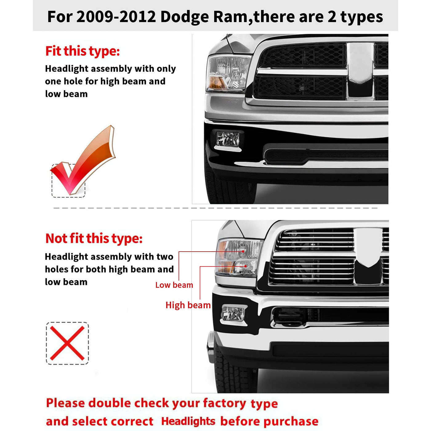 Vehicle compatibility: headlights assembly compatible with 2009-2012 Dodge Ram 1500 / 2010-2012 Dodge Ram 2500 3500; high beam/low beam bulb type: H13; bulbs are not included | Waterproof: fully sealed with solid silicon & designed with one-way vents to prevent moisture from being trapped inside the housing, no corrosion or moisture worries in sorts of weather conditions | Brighter lighting: the metallic parabolic reflectors provide more light output to create a broader and smoother beam | Safety reflector: the sided micro-prism reflector makes the oncoming cars or passerby quickly notice you at night, ensuring your driving safety and others' | Impact resistance: the polycarbonate lens & tough housing are highly resistant to shock, vibration for any tough road; professional installation would be highly recommended