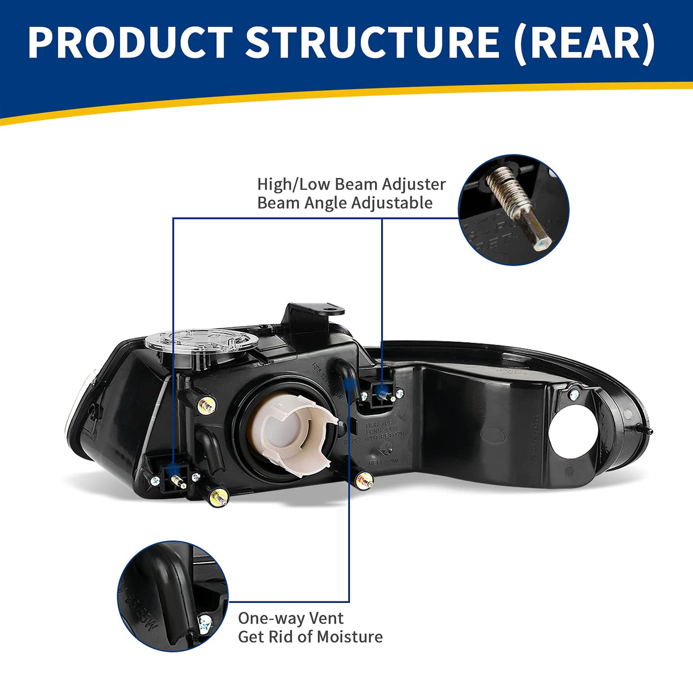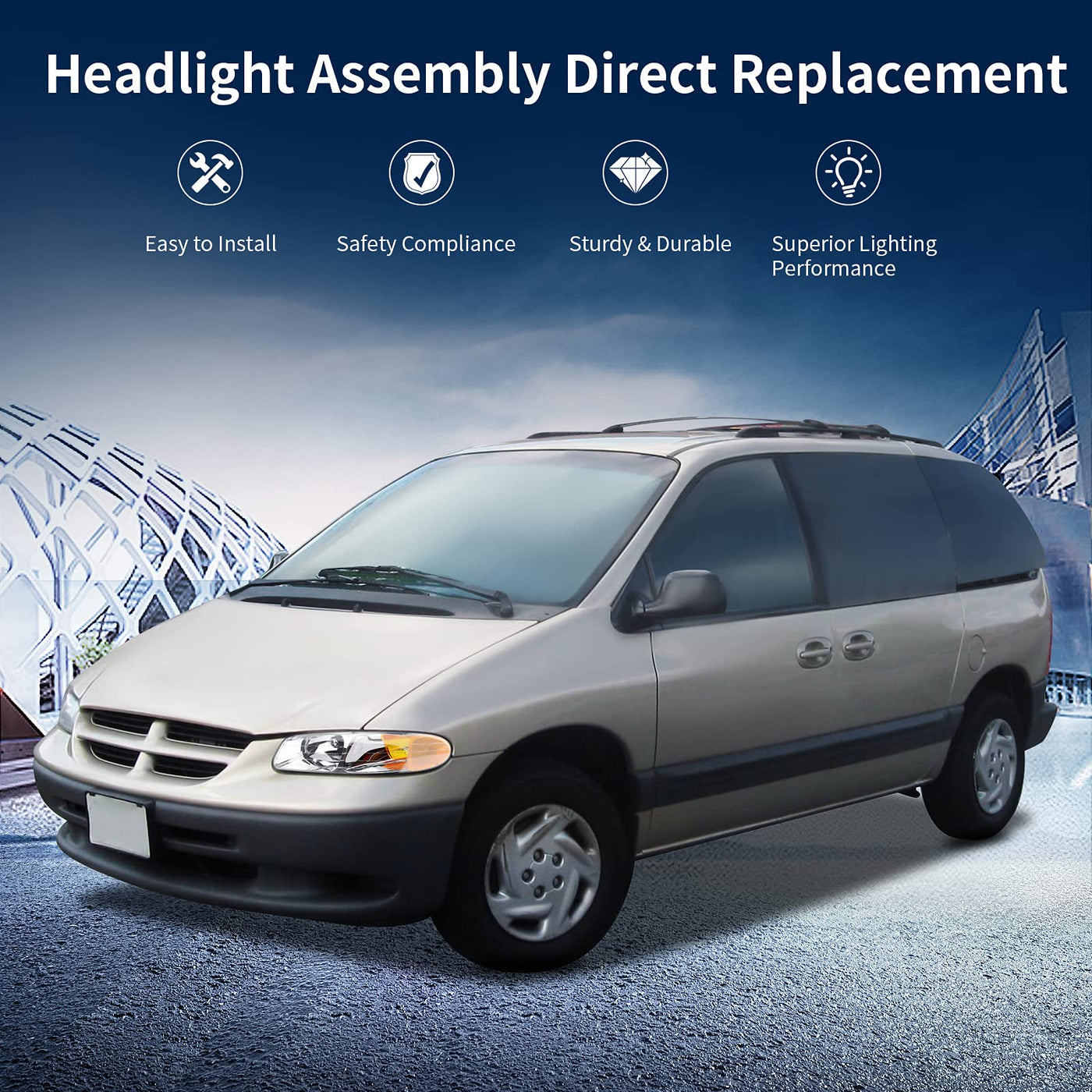 Vehicle compatibility: headlights assembly compatible with 1996-1999 Dodge Caravan 1996-1999 Chrysler Town & Country / 1996-1999 Plymouth Voyager / 1996-1999 Plymouth Grand Voyager; without Quad Lamp; high beam/low beam bulb type: 9007; bulbs are not included | Waterproof: fully sealed with solid silicon & designed with one-way vents to prevent moisture from being trapped inside the housing, no corrosion or moisture worries in sorts of weather conditions | Brighter lighting: the metallic parabolic reflectors provide more light output to create a broader and smoother beam | Safety reflector: the sided micro-prism reflector makes the oncoming cars or passerby quickly notice you at night, ensuring your driving safety and others' | Impact resistance: the polycarbonate lens & tough housing are highly resistant to shock, vibration for any tough road; professional installation would be highly recommended