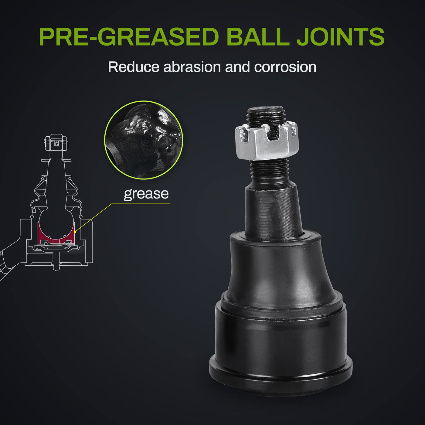 [OE Replacement] - Precision tolerance manufactured to directly replace OE parts for proper fit and alignment | [Durability and Strength] - Parts are stamped from a solid piece of steel and are electrophoretic coated for unrivaled durability and strength | [Pre-Greased] - Neccessary parts are pre-greased requiring no additional work. Comes with grease nipples, ball joint can be filled with grease in maintenance | [Package Content] - 2x Front lower control arm, 2x Front lower ball joint, 4x Front tie rod end and 2x Front sway bar end link | [Attention] - Be sure to verify vehicle compatibility using the