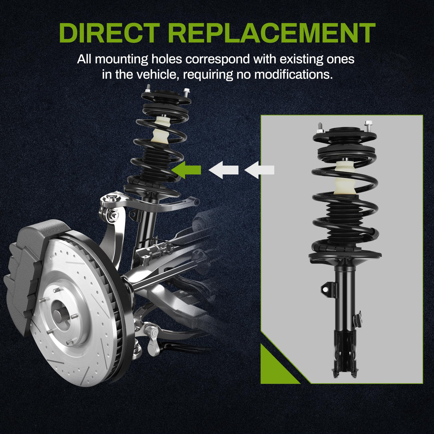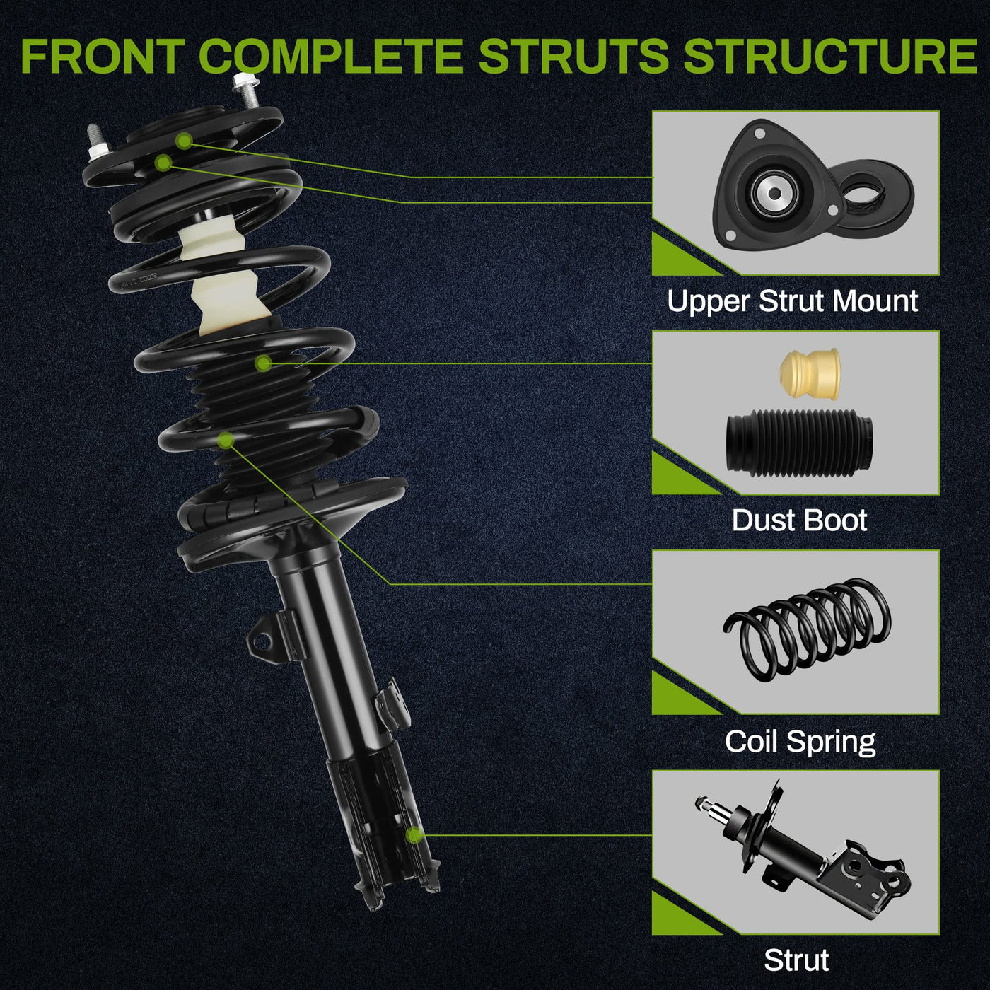Vehicle compatibility: The pair of front quick struts is compatible with 2009 2010 2011 2012 2013 Corolla, 2009 2010 Matrix Pontiac Vibe | Safe & simple installation: Features buckle holes that correspond with existing ones in the vehicle, so it can be easily replaced without disassembling previous strut structure | Up to standard: Complete package includes struts, coil springs (if needed), mount, boot, bumper kit, spring seat, and isolator. All components are built to meet performance requirements | Replacement part numbers: 172598; 172597 | Existing struts should be replaced if your vehicle: 1) makes abnormal sounds, 2) dips when carrying heavy loads or driving on poor roads, 3) suffers leakage, 4) suffers tire wear, 5) is difficult to control, 6) has poor stability(NOTE: Professional installation would be highly recommended)