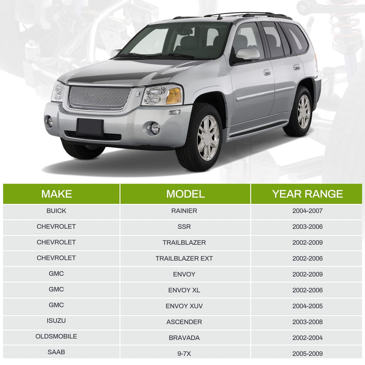 Vehicle Fitment: Control Arm Assembly Compatible With 2004-07 Buick Rainier, [2003-06 Chevy Ssr, 2002-09 Chevy Trailblazer, 2002-06 Chevy Trailblazer Ext], [2002-09 Gmc Envoy, 2002-06 Gmc Envoy Xl, 2004-05 Gmc Envoy Xuv], 2003-08 Isuzu Ascender, 2002-04 Oldsmobile Bravada, 2005-09 Saab 9-7X | [Oe Replacement] - Designed And Manufactured To Directly Replace Oe Parts For Proper Fit And Alignment. Directly Replaces Oem #: 19330400, 19330399 And 19133638 | [Durability And Strength] - Our Control Arms Are Stamped From A Solid Piece Of Steel And Are Electrophoretic Coated For Unrivaled Durability And Strength. Greaseable Parts Are Pre-Greased Requiring No Additional Work | [Important Note] - Be Sure To Verify Vehicle Compatibility By Referring To 'Product Description' Or Using The 'Amazon Parts Checker' | [Package Content] - 1X Front Driver Side Upper Control Arm W/Bushing, 1X Front Passenger Side Upper Control Arm W/Bushing And 2X Front Upper Ball Joints