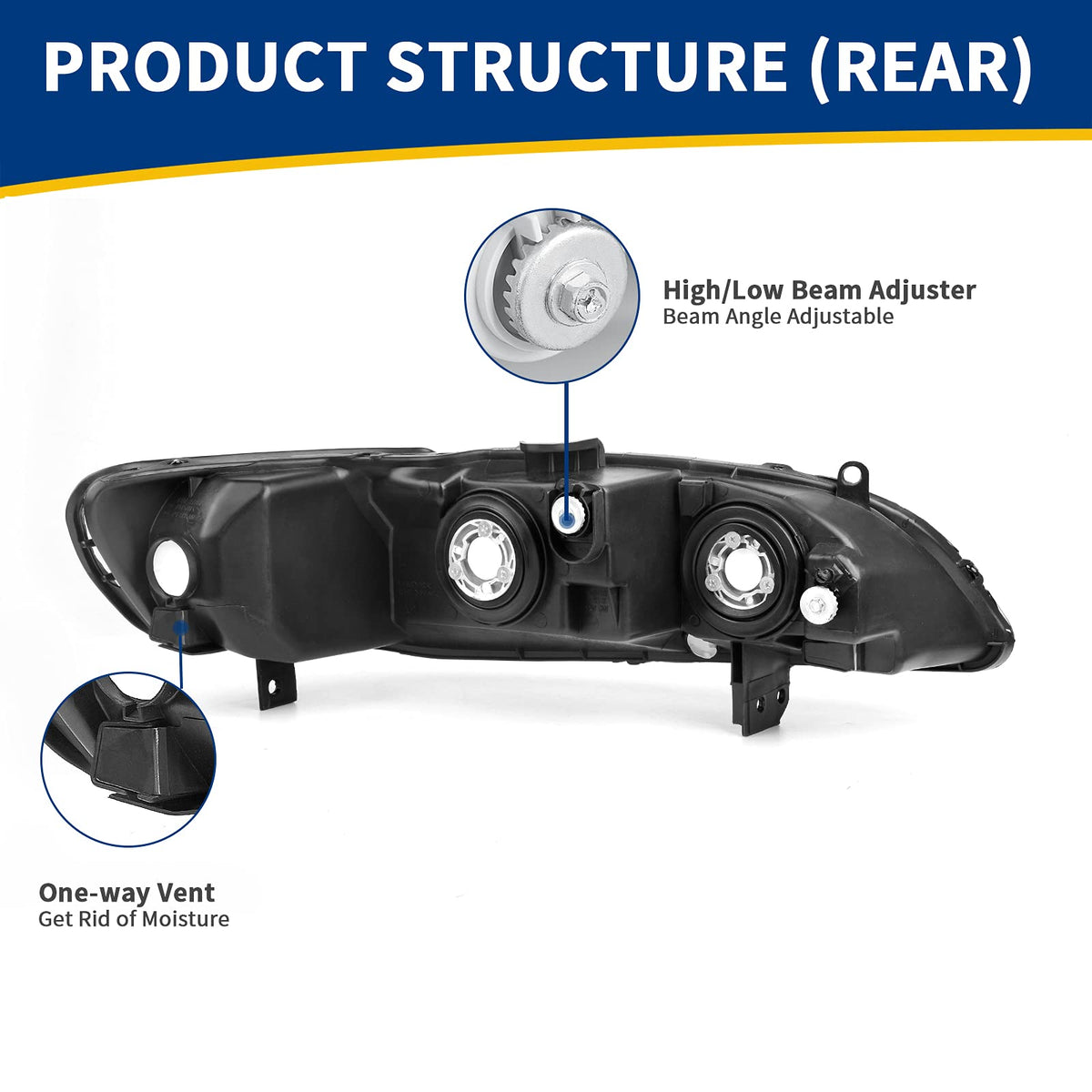 Vehicle compatibility: headlights assembly compatible with 1998 1999 2000 2001 2002 Accord; high beam: 9005; low beam: 9006; bulbs are not included | Waterproof: fully sealed with solid silicon & designed with one-way vents to prevent moisture from being trapped inside the housing, no corrosion or moisture worries in sorts of weather conditions | Brighter lighting: the metallic parabolic reflectors provide more light output to create a broader and smoother beam | Safety reflector: the sided micro-prism reflector makes the oncoming cars or passerby quickly notice you at night, ensuring your driving safety and others' | Impact resistance: the polycarbonate lens & tough housing are highly resistant to shock, vibration for any tough road; professional installation would be highly recommended