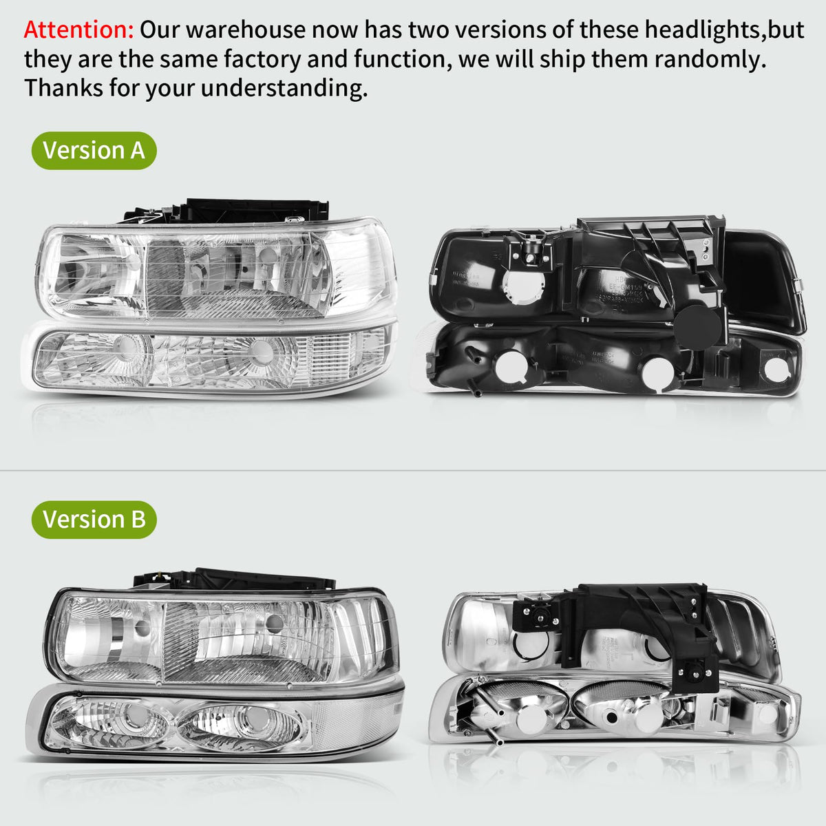 Vehicle Compatibility: Headlights Assembly Compatible With 1999-2002 Chevrolet Silverado 1500 / 2500; 2001-2002 Chevrolet Silverado 1500Hd / 2500Hd / 3500; 2000-2006 Chevrolet Suburban 1500 / 2500; 2000-2006 Chevrolet Tahoe; High Beam Bulb Type: Hb3/9005; Low Beam Bulb Type: Hb4/9006; Bulbs Are Not Included Note: Not Compatible With Gmc Sierra. | Waterproof: Fully Sealed With Solid Silicon & Designed With One-Way Vents To Prevent Moisture From Being Trapped Inside The Housing, No Corrosion Or Moisture Worries In Sorts Of Weather Conditions | Brighter Lighting: The Metallic Parabolic Reflectors Provide More Light Output To Create A Broader And Smoother Beam (Adjustable Beam Angle About