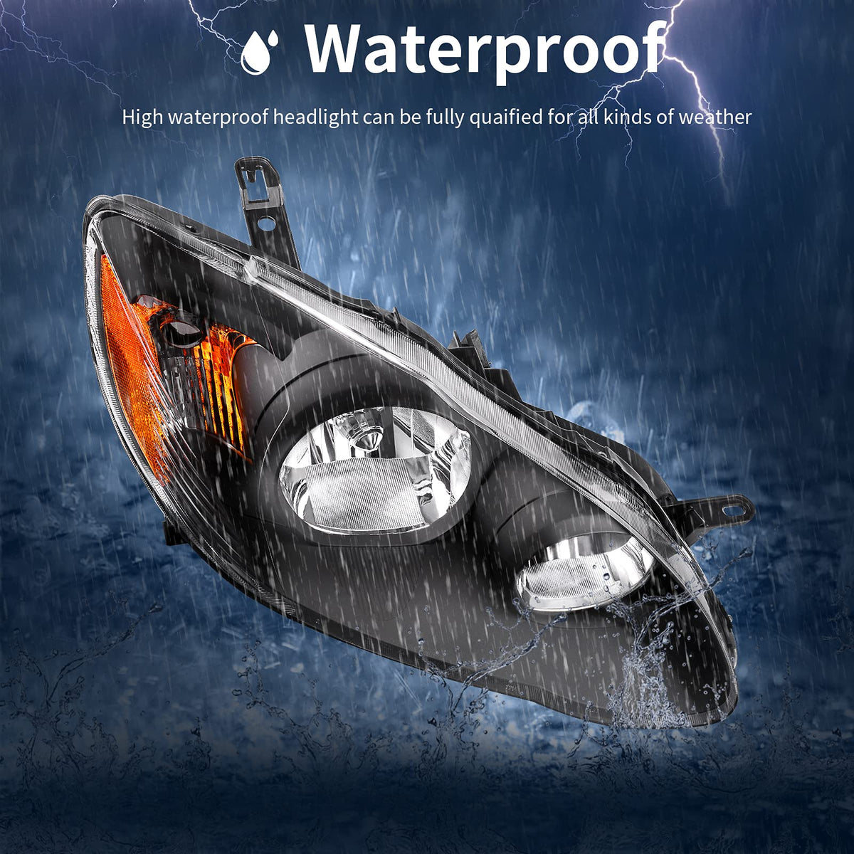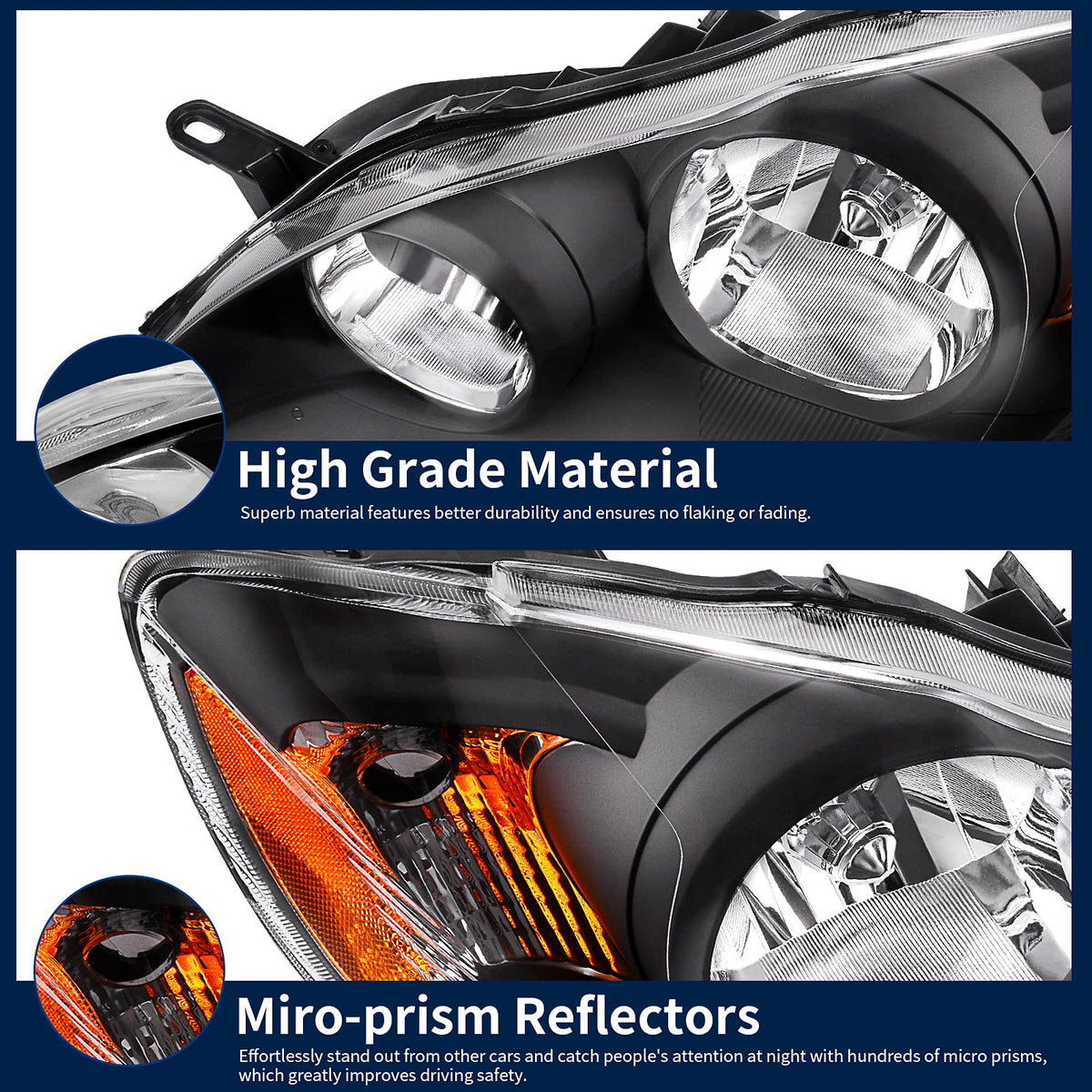 Vehicle compatibility: headlights assembly compatible with 2003 2004 2005 2006 2007 2008 Corolla; low beam: 9006 high beam: 9005; bulbs are not included | Waterproof: fully sealed with solid silicon & designed with one-way vents to prevent moisture from being trapped inside the housing, no corrosion or moisture worries in sorts of weather conditions | Brighter lighting: the metallic parabolic reflectors provide more light output to create a broader and smoother beam | Safety reflector: the sided micro-prism reflector makes the oncoming cars or passerby quickly notice you at night, ensuring your driving safety and others' | Impact resistance: the polycarbonate lens & tough housing are highly resistant to shock, vibration for any tough road; professional installation would be highly recommended