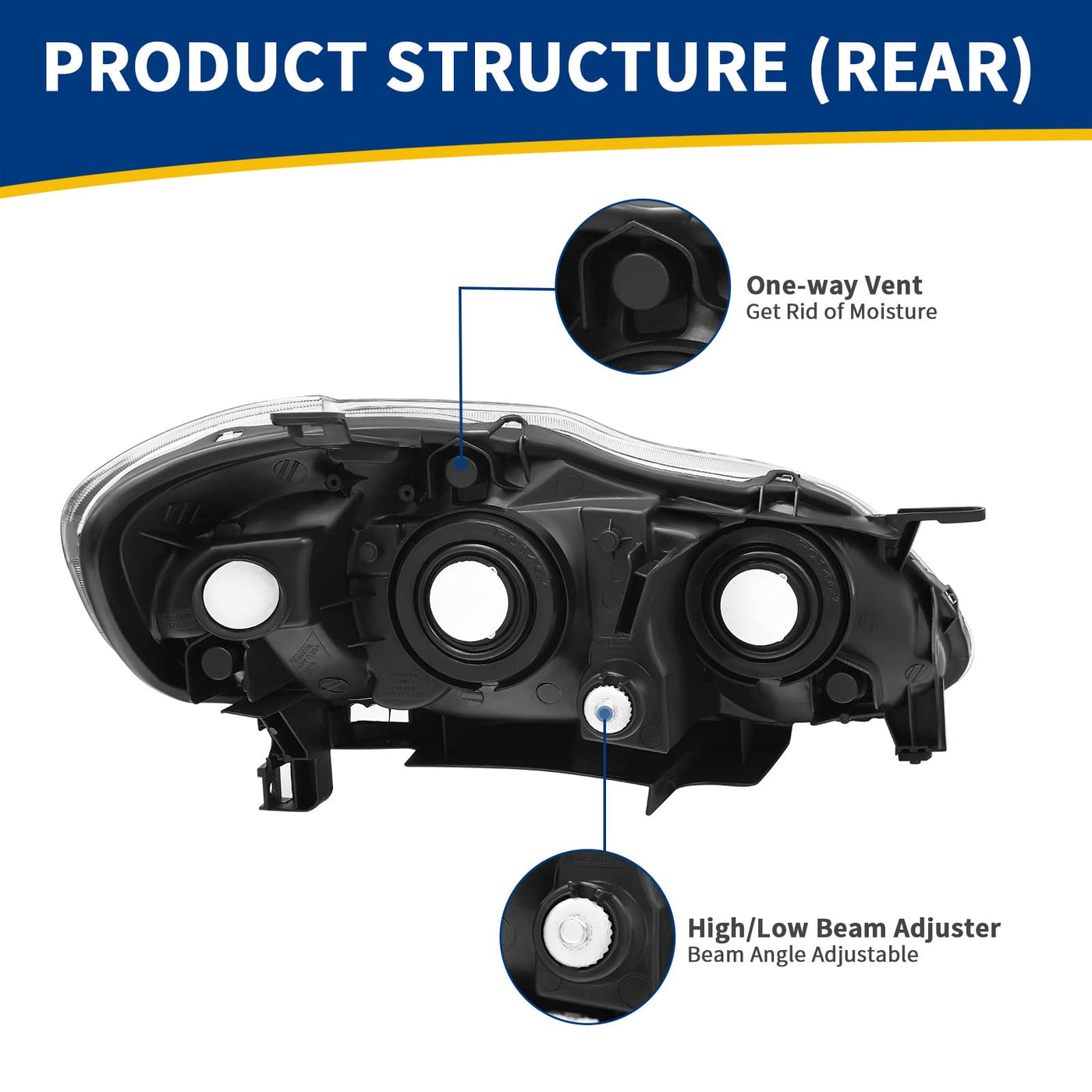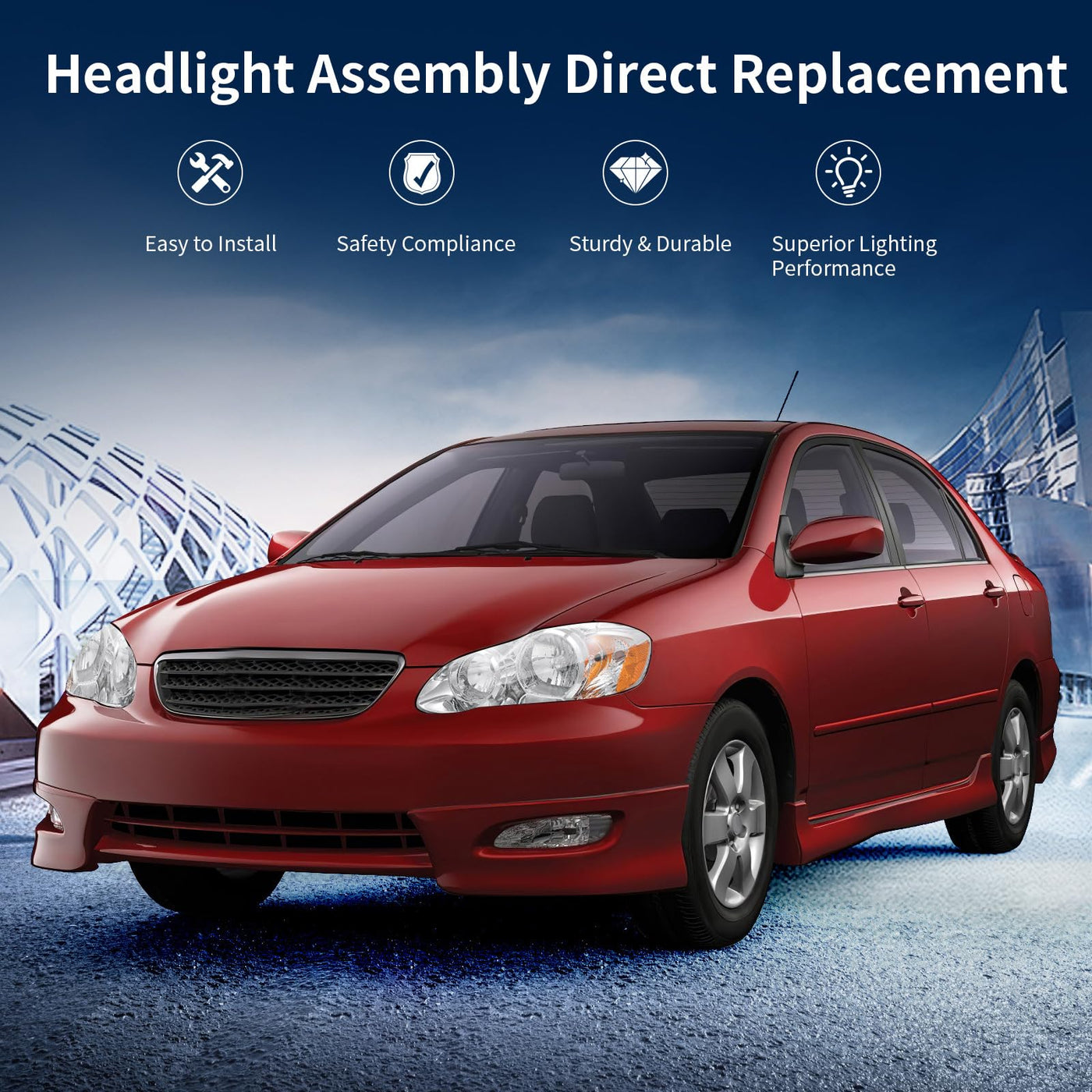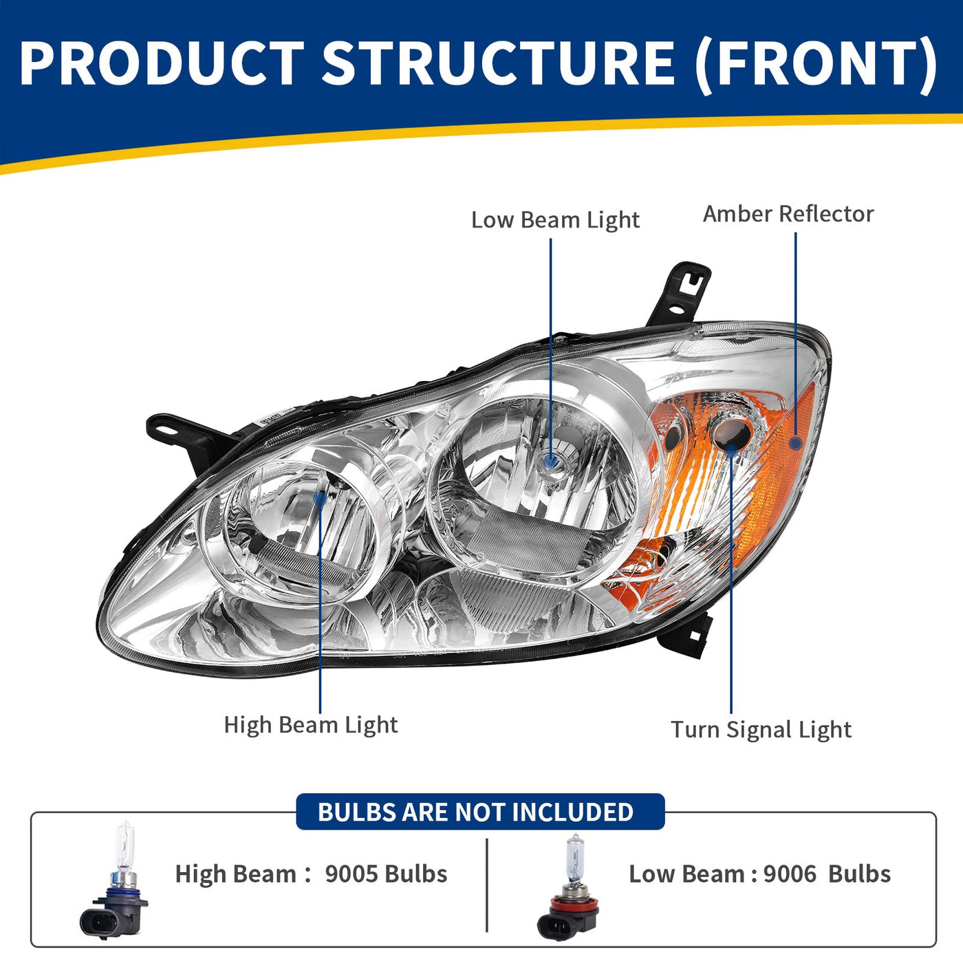 Vehicle compatibility: headlights assembly compatible with 2003 2004 2005 2006 2007 2008 Corolla; low beam: 9006 high beam: 9005; bulbs are not included | Waterproof: fully sealed with solid silicon & designed with one-way vents to prevent moisture from being trapped inside the housing, no corrosion or moisture worries in sorts of weather conditions | Brighter lighting: the metallic parabolic reflectors provide more light output to create a broader and smoother beam | Safety reflector: the sided micro-prism reflector makes the oncoming cars or passerby quickly notice you at night, ensuring your driving safety and others' | Impact resistance: the polycarbonate lens & tough housing are highly resistant to shock, vibration for any tough road; professional installation would be highly recommended
