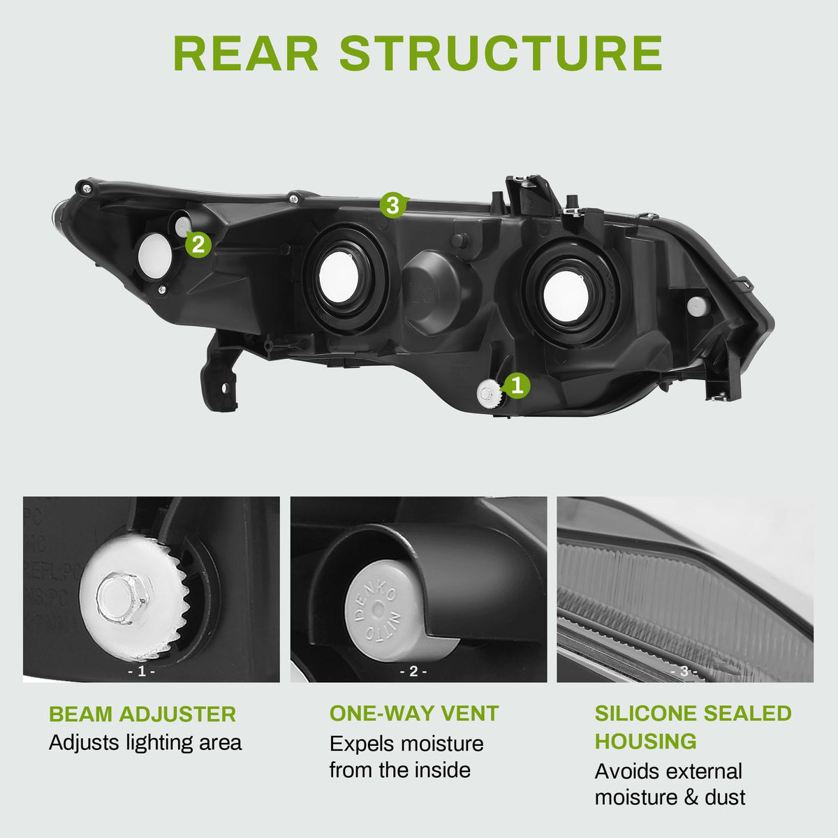 Vehicle compatibility: headlights assembly compatible with 2006 2007 2008 2009 2010 2011 Civic 2 Door Coupe; high beam: 9005 / low beam: 9006; bulbs are not included | Waterproof: fully sealed with solid silicon & designed with one-way vents to prevent moisture from being trapped inside the housing, no corrosion or moisture worries in sorts of weather conditions | Brighter lighting: the metallic parabolic reflectors provide more light output to create a broader and smoother beam | Safety reflector: the sided micro-prism reflector makes the oncoming cars or passerby quickly notice you at night, ensuring your driving safety and others' | Impact resistance: the polycarbonate lens & tough housing are highly resistant to shock, vibration for any tough road; professional installation would be highly recommended