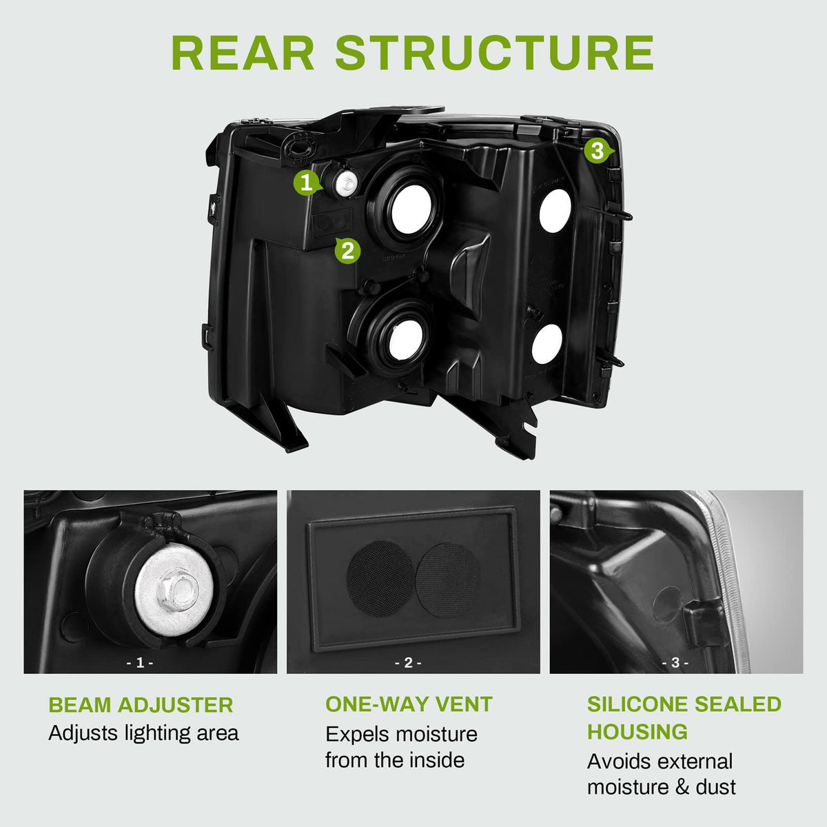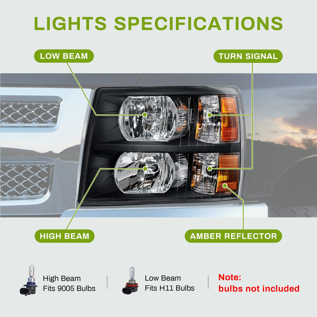 Vehicle compatibility: headlights assembly compatible with 2007 - 2013 Chevrolet Silverado 1500 / 2007 - 2014 Chevrolet Silverado 2500 HD / 2007 - 2014 Chevrolet Silverado 3500 HD (not fit 2007 Chevrolet Silverado Classic); high beam bulb type: HB3/9005; low beam bulb type: H11; bulbs are not included | Waterproof: fully sealed with solid silicon & designed with one-way vents to prevent moisture from being trapped inside the housing, no corrosion or moisture worries in sorts of weather conditions | Brighter lighting: the metallic parabolic reflectors provide more light output to create a broader and smoother beam | Safety reflector: the sided micro-prism reflector makes the oncoming cars or passerby quickly notice you at night, ensuring your driving safety and others' | Impact resistance: the polycarbonate lens & tough housing are highly resistant to shock, vibration for any tough road; professional installation would be highly recommended