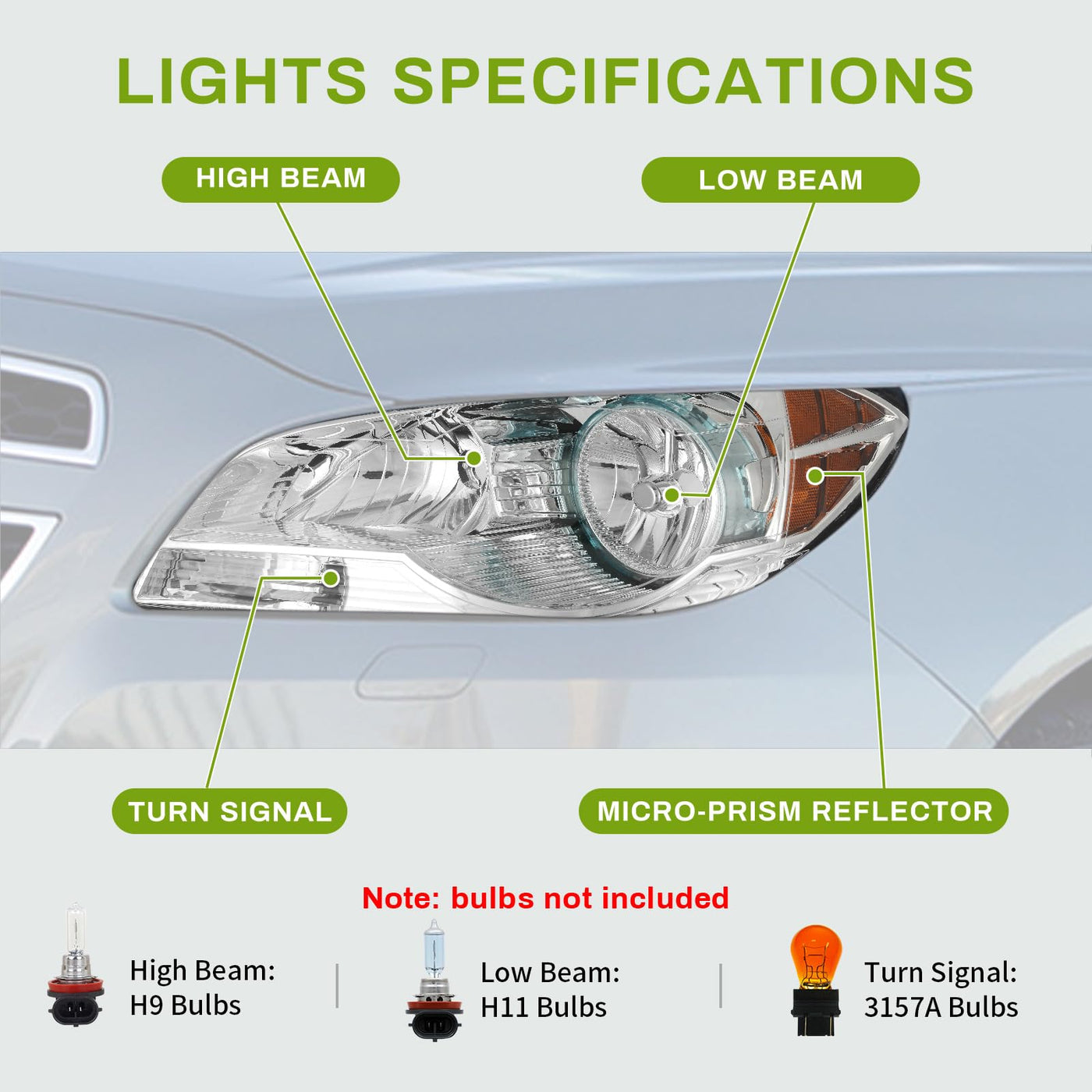 Vehicle compatibility: the headlights assembly is compatible with 2008-2012 08 09 10 11 12 Chevy Malibu 2008 2009 2010 2011 2012 08-12. (Only Fits 2008 Chevy Malibu New Body,Not Fits 2008 Chevy Malibu Clasic). High Beam: H9; Low Beam: H11; Signal Light: 4157NA; Parking Light: 4157NA; Side Marker Light: 194. Bulbs are not included. OEM Part Number: 25984637, 25984638,22897127, 22897126. Partslink Number: GM2502307, GM2503307 | Waterproof: fully sealed with solid silicon & designed with one-way vents to prevent moisture from being trapped inside the housing, no corrosion or moisture worries in sorts of weather conditions | Brighter lighting: the metallic parabolic reflectors provide more light output to create a broader and smoother beam | Safety reflector: the sided micro-prism reflector makes the oncoming cars or passerby quickly notice you at night, ensuring your driving safety and others' | Impact resistance: the polycarbonate lens & tough housing are highly resistant to shock, vibration for any tough road; professional installation would be highly recommended