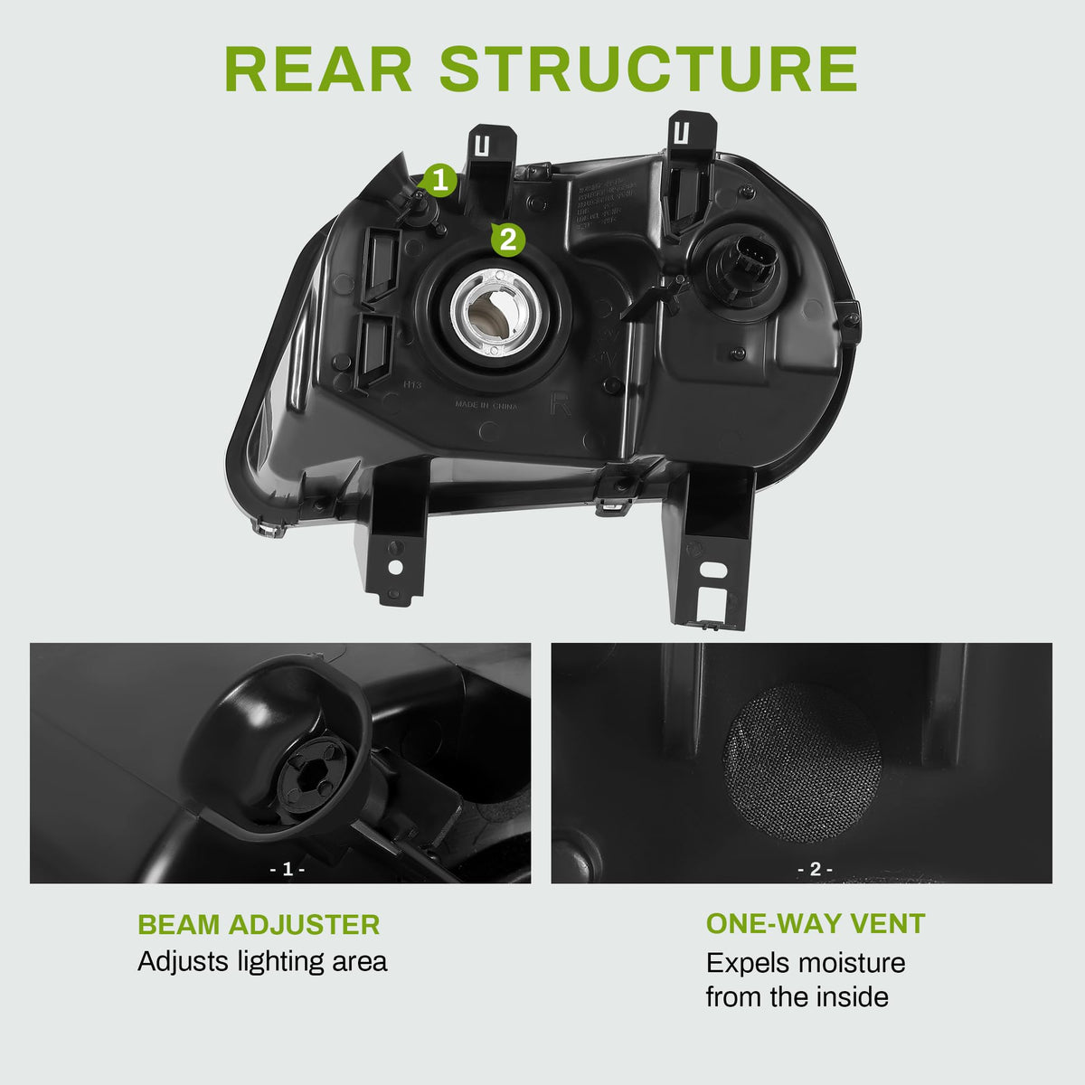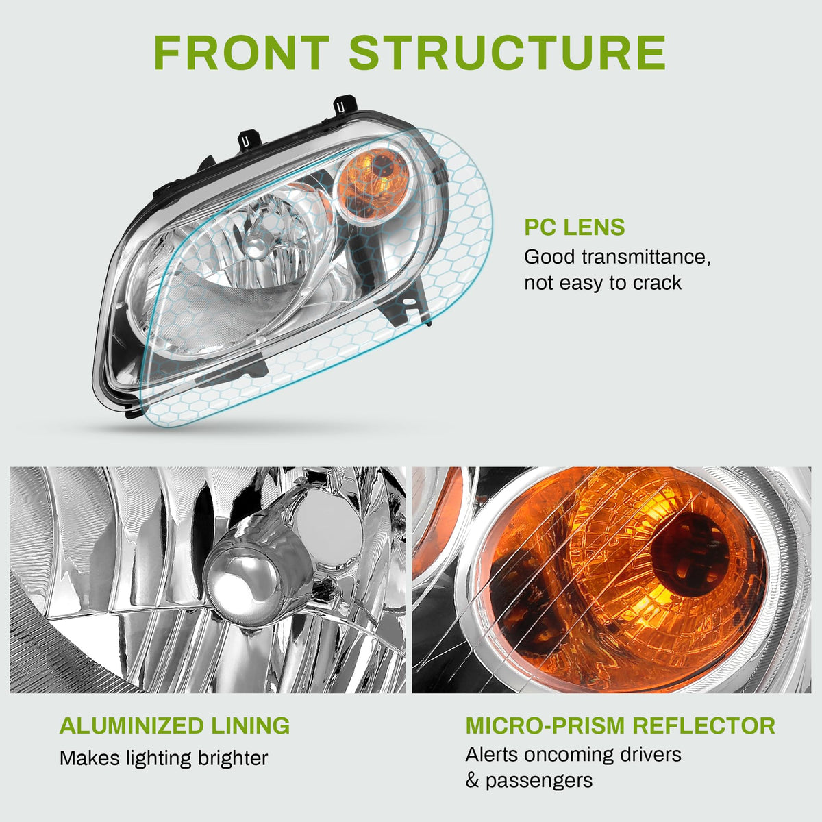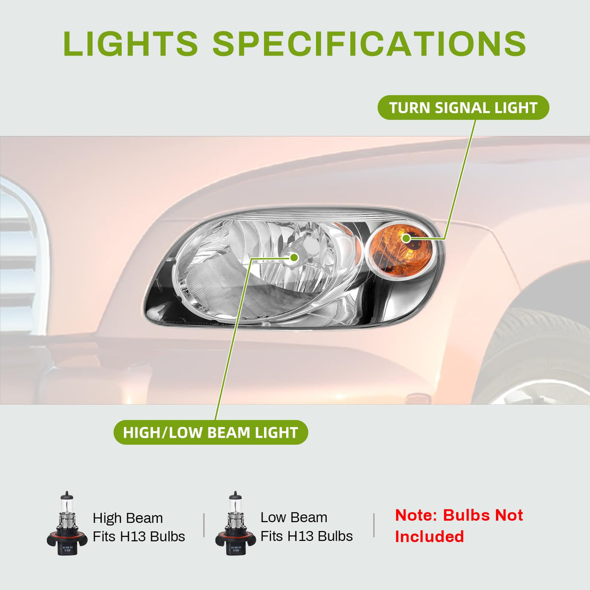Vehicle compatibility: the headlights assembly is compatible with 2006 2007 2008 2009 2010 2011 Chevy Chevrolet HHR; Not Compatible on 2007-2010 HHR RPO-B2E Models; high beam bulb type/low beam bulb type: H13; bulbs are not included | Brighter lighting: the metallic parabolic reflectors provide more light output to create a broader and smoother beam | Waterproof: fully sealed with solid silicon & designed with one-way vents to prevent moisture from being trapped inside the housing, no corrosion or moisture worries in sorts of weather conditions such as rain, snow or dust storms | Safety reflector: the sided micro-prism reflector makes the oncoming cars or passerby quickly notice you at night, ensuring your driving safety and others' | Impact resistance: the polycarbonate lens & tough housing are highly resistant to shock, vibration for any tough road; professional installation would be highly recommended