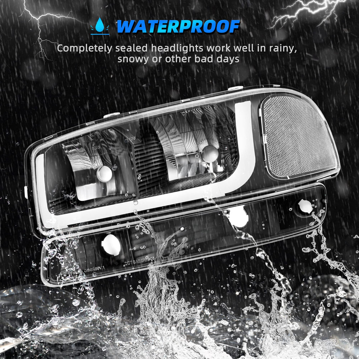 Q: Are these headlights waterproof and suitable for all weather conditions?A: Yes, the AUTOSAVER88 LED DRL Headlights Assembly is fully sealed with solid silicon and designed with one-way vents to prevent moisture build-up, making them waterproof and suitable for all weather conditions.