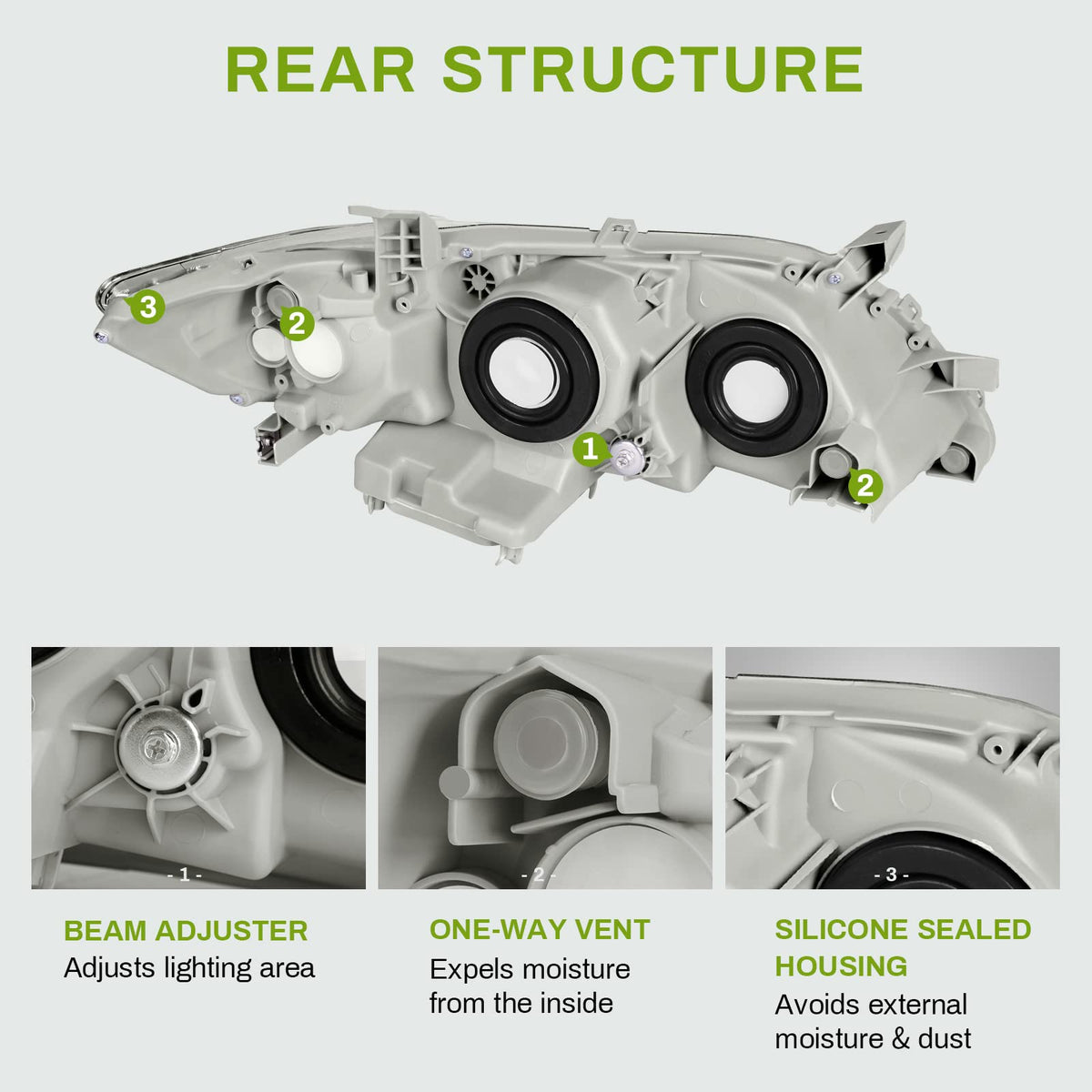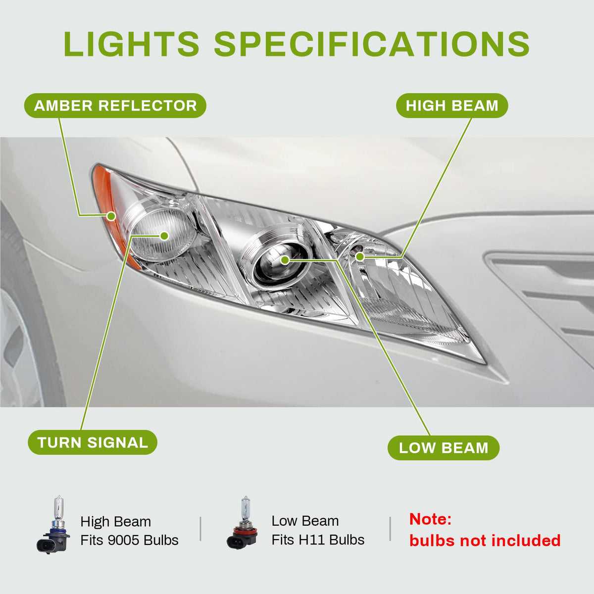 Vehicle compatibility: headlights assembly compatible with 2007 2008 2009 Camry; only fits US Version, not fits Camry Hybrid Model; low beam: H11, high beam: 9005/HB3; bulbs are not included | Waterproof: fully sealed with solid silicon & designed with one-way vents to prevent moisture from being trapped inside the housing, no corrosion or moisture worries in sorts of weather conditions | Brighter lighting: the metallic parabolic reflectors provide more light output to create a broader and smoother beam | Safety reflector: the sided micro-prism reflector makes the oncoming cars or passerby quickly notice you at night, ensuring your driving safety and others' | Impact resistance: the polycarbonate lens & tough housing are highly resistant to shock, vibration for any tough road; professional installation would be highly recommended