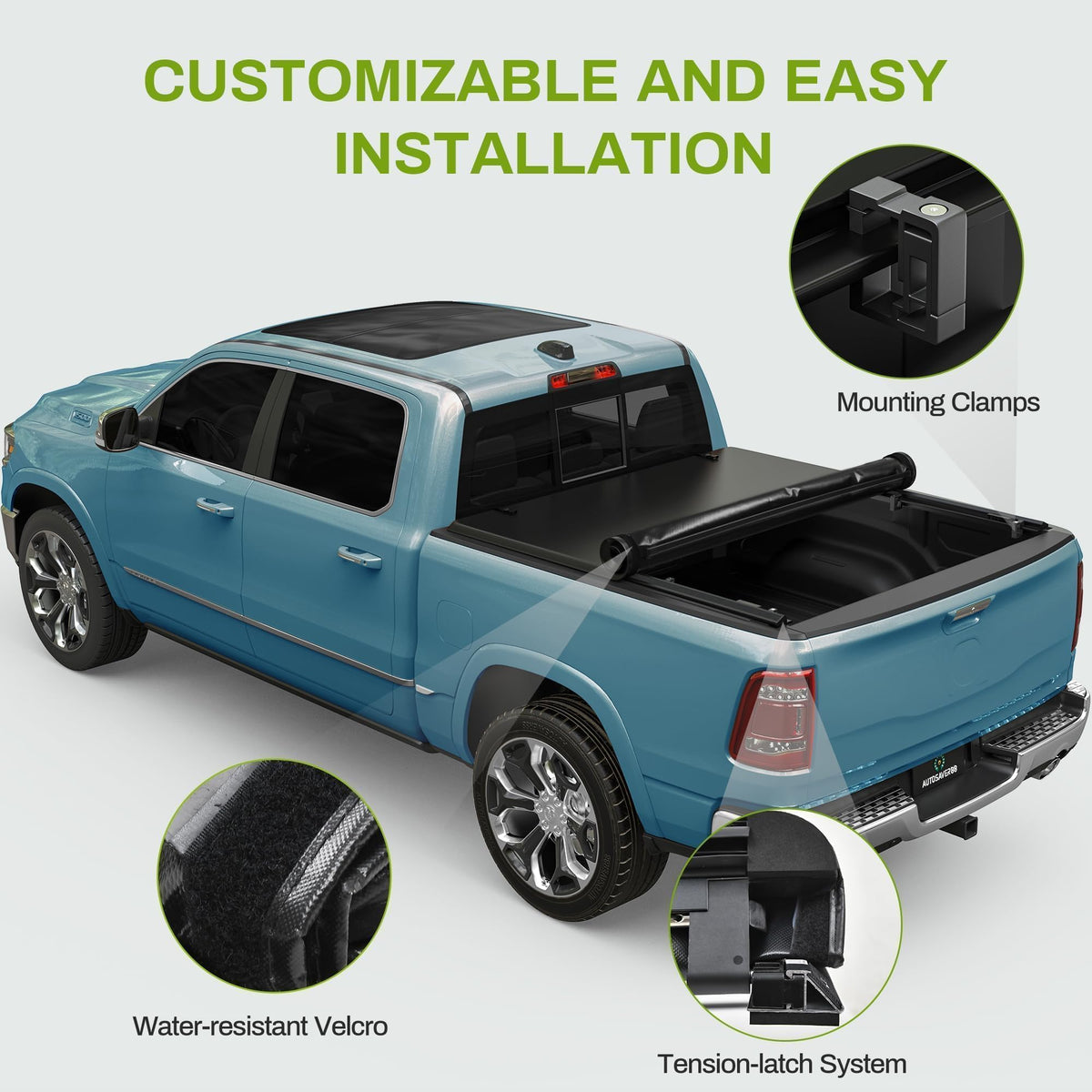 Compatibility: Autosaver88 soft roll up tonneau cover is compatible with the 2002-2018 Dodge Ram 1500; 2019 2020 2021 2022 2023 Ram 1500 Classic; 2003-2025 2500 3500 8 ft / 96.3'' bed without Rambox, Split Tailgate and Bed Track System. | Painless Operation: No-drill clamps fasten the tonneau cover rails to your truck bed; Hassle-free installation with instructions and mounting hardware included; Access the entire bed by simply rolling the cover up to bulkhead | Water-Repellent: Arched crossbars are specially designed to enable water flow off the surface, preventing water accumulation and potential damage caused by the extra weight | Quality That Lasts: Double-layer PVC cover resists tear and abrasion for long-lasting use; Sturdy aluminum framework and side rails work seamlessly with stainless steel clamps to create a strong and secure seal | Tension & Latch System: Reliable spring latching system pairs with an adjustable tension system to maintain a tight and even fit, preventing the cover from getting wrinkles or folds so you enjoy all-around protection regardless of inclement weather