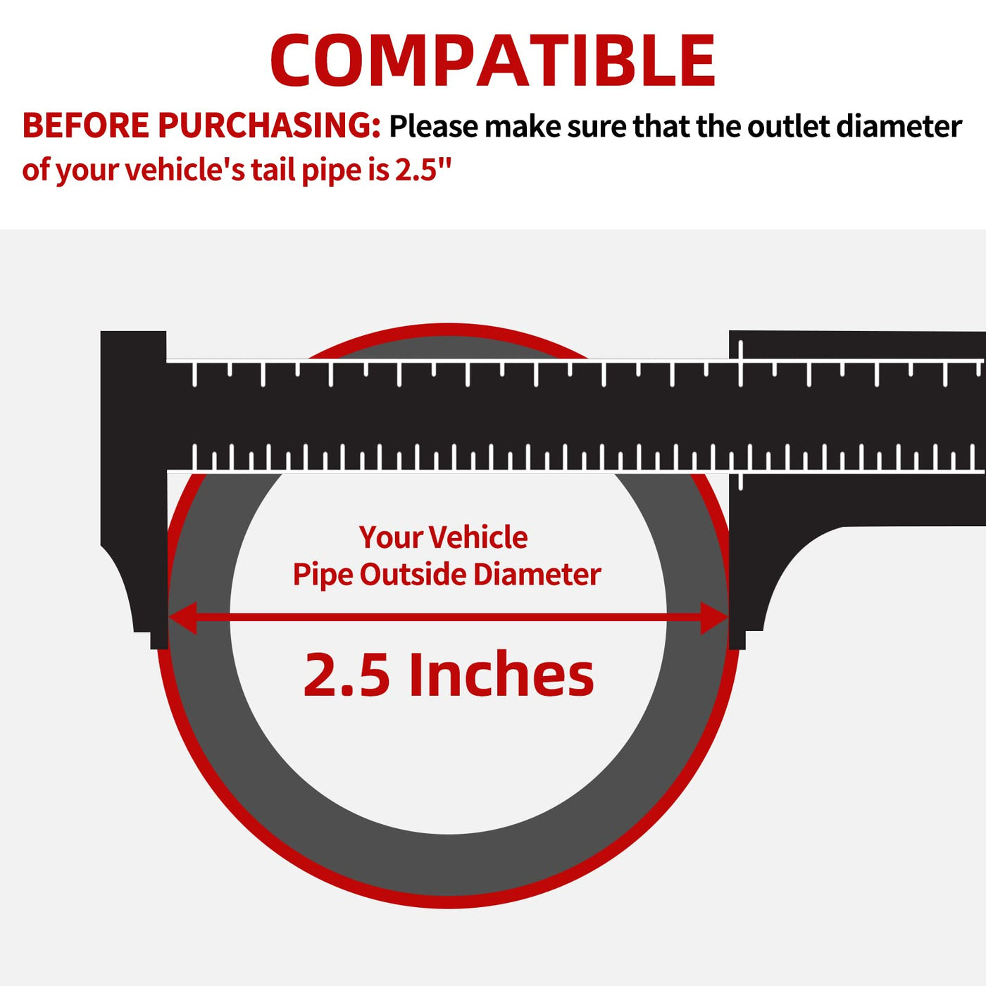 Q: Is this exhaust tip compatible with all vehicles?A: This exhaust tip is designed for universal fitment on vehicles with a 2.5-inch outer diameter exhaust pipe. Please ensure your tailpipe's outlet outer diameter is 2.5 inches before purchasing.
