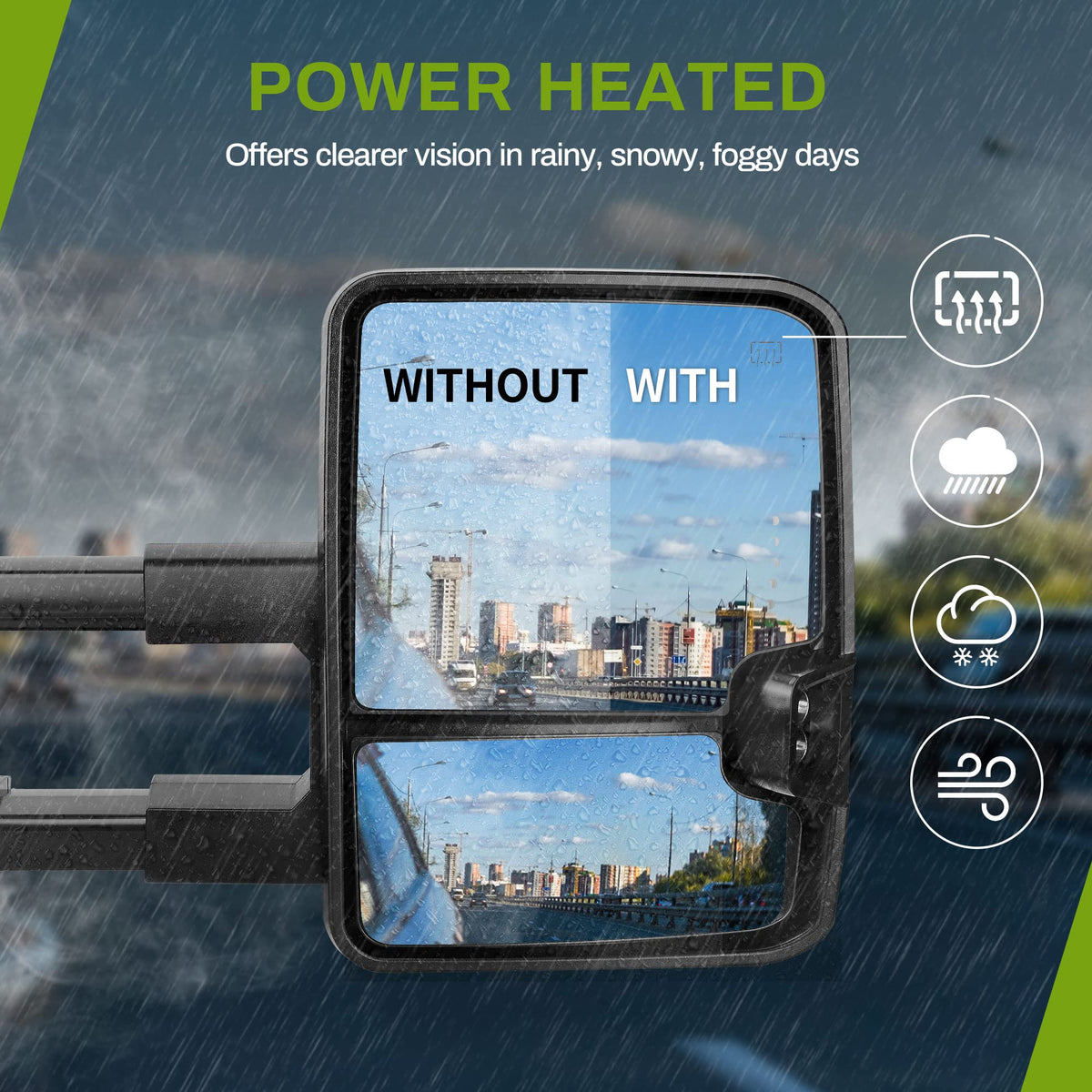 Q: Can the mirrors be used in inclement weather?A: Yes, the power heated feature of these mirrors helps to remove frost and mist, keeping the mirrors clear during rain and snowfall, which significantly improves visibility.