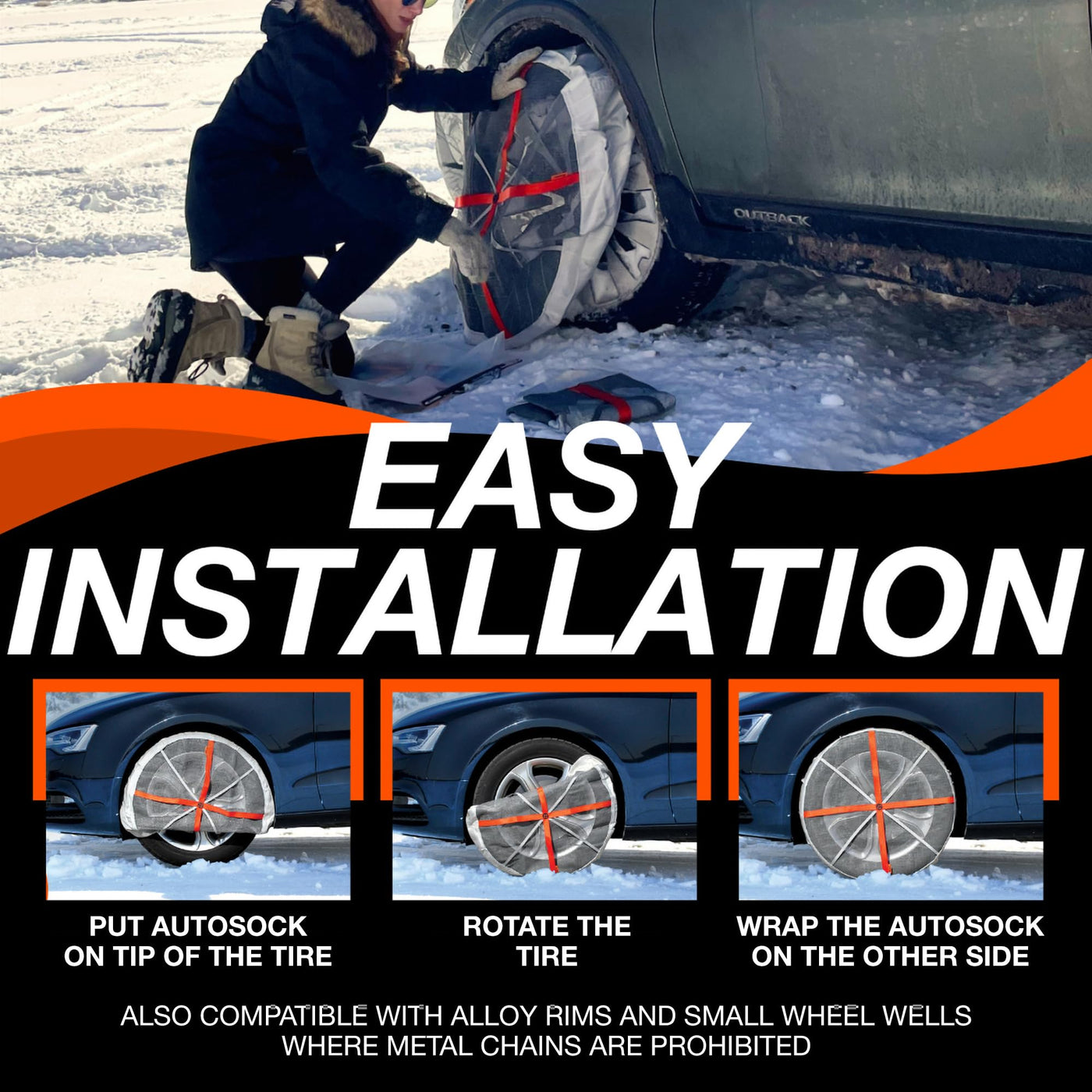 Q: How do I install AutoSocks on my tires?A: Installing AutoSocks is straightforward. Simply follow these three steps: 1) Lay the AutoSock flat on the ground, 2) Drive over it so that it sits under the front tires, and 3) Move the vehicle forward a short distance to allow the sock to fit snugly around the tires. The entire process takes just a few minutes.