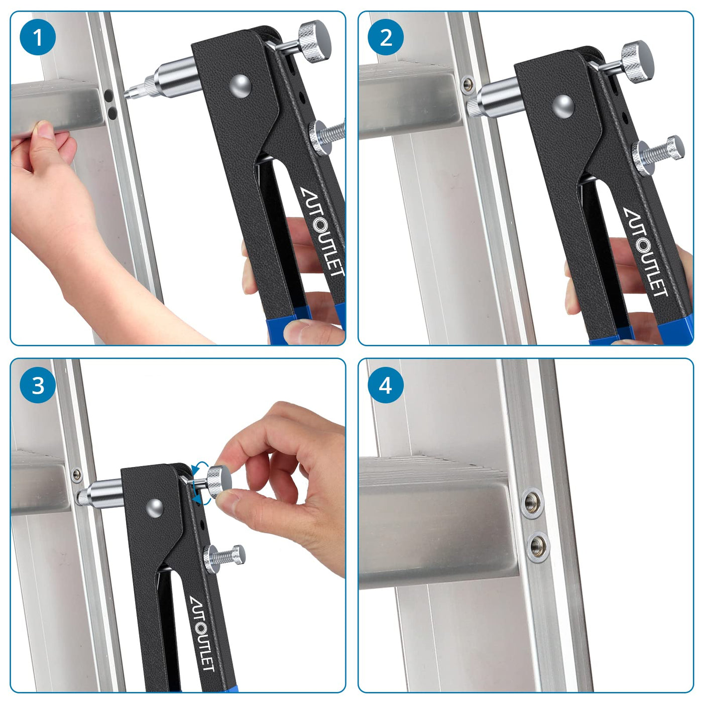 Q: How do I use the AUTOUTLET rivet gun?A: To use the AUTOUTLET rivet gun, first select the appropriate mandrel size, then insert the rivet nut into the tool and squeeze the handles. This will secure the rivet nut in place.