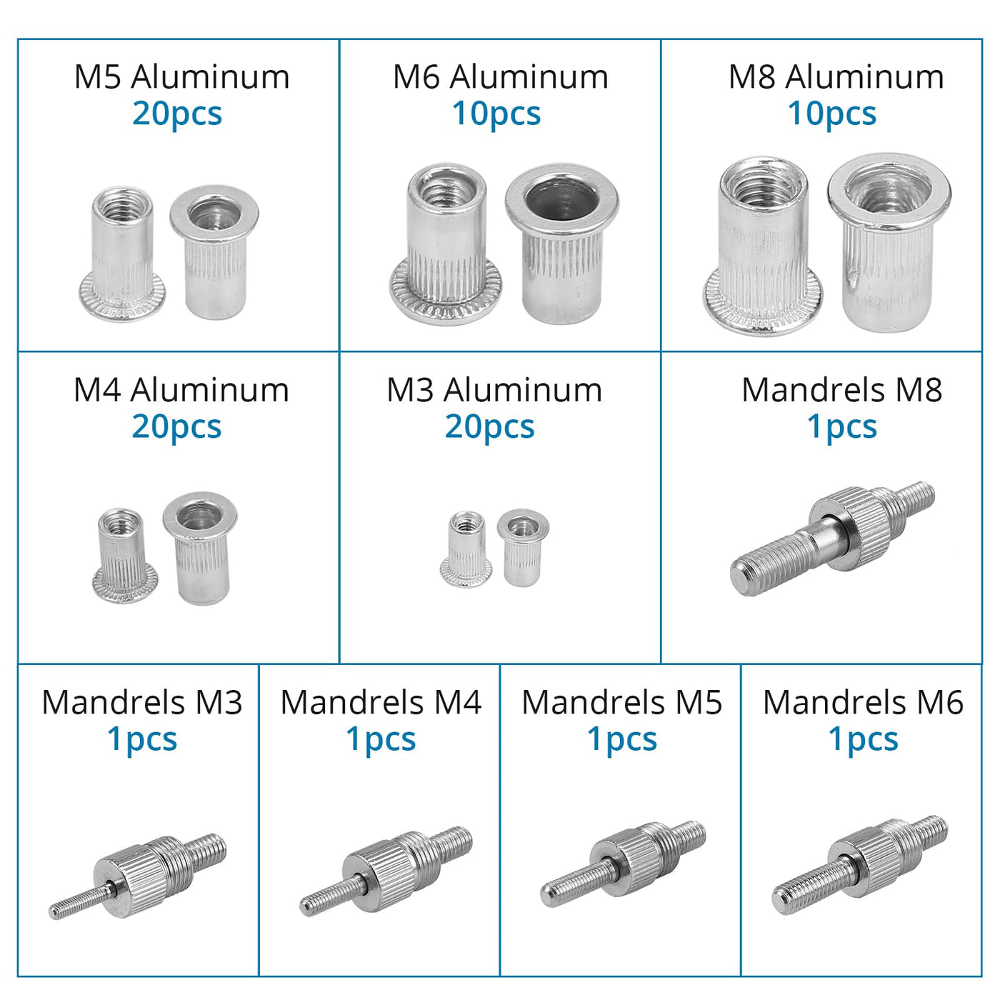 Q: What types of rivet nuts are included with the kit?A: The kit includes twenty M3, twenty M4, twenty M5, ten M6, and ten M8 threaded rivet nut inserts. This range meets various fastening needs.
