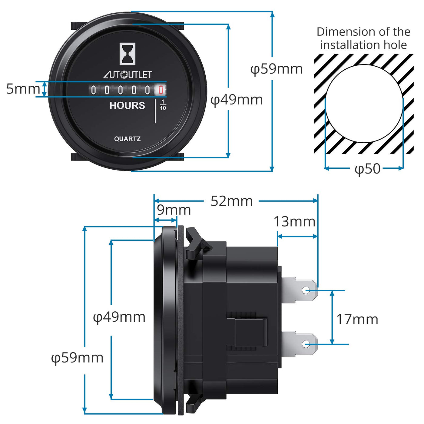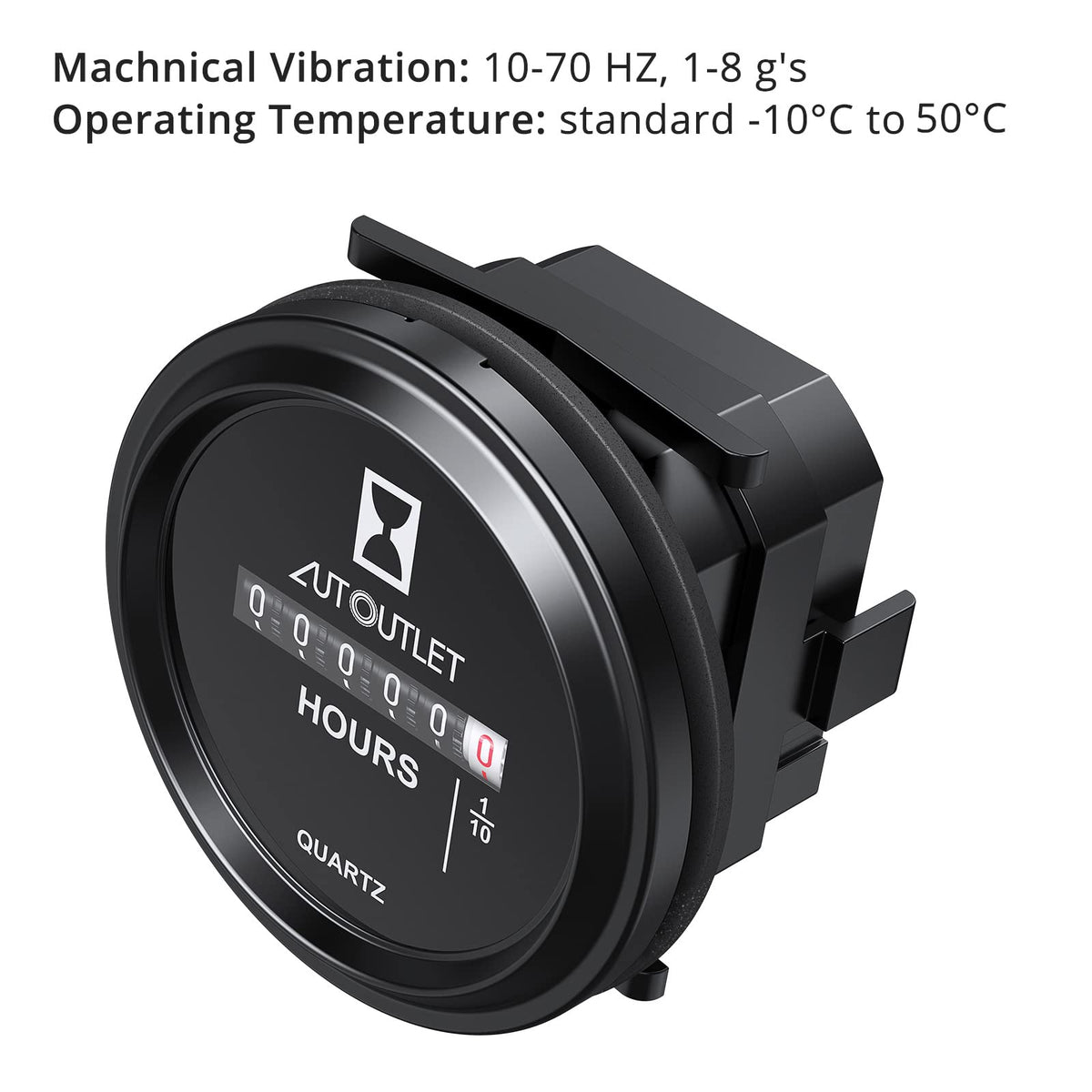 Precision Engine Hour Tracking: The AUTOUTLET Quartz Hour Meter is designed for accurate tracking of engine hours, helping you monitor service intervals and maintain your precision equipment on time | Wide Voltage Compatibility: With a voltage supply range of 12 to 72 Volts DC, this hour meter is compatible with a variety of engines, including boats, motorcycles, ATVs, UTVs, lawn tractors, and more | Waterproof & Durable Design: Featuring a polycarbonate construction with a black bezel, the hour meter is both water-resistant and built to withstand harsh environments, ensuring longevity and reliable performance | Easy Installation: With a 2-inch hole size and a compact design (2.3-inch outside diameter and 1.7-inch depth), this hour meter can be easily mounted on dashboards or in other inconspicuous spaces, making it ideal for multiple vehicle types | Wide Range of Applications: Perfect for use in a variety of machinery such as generators, snowmobiles, pumps, go-carts, and more, this hour meter ensures you can accurately track the operating hours of various equipment | Notice:It is recommended to work indoors or in the car to prevent rainwater from getting wet for a long time.Please pay attention to vibration strength when using