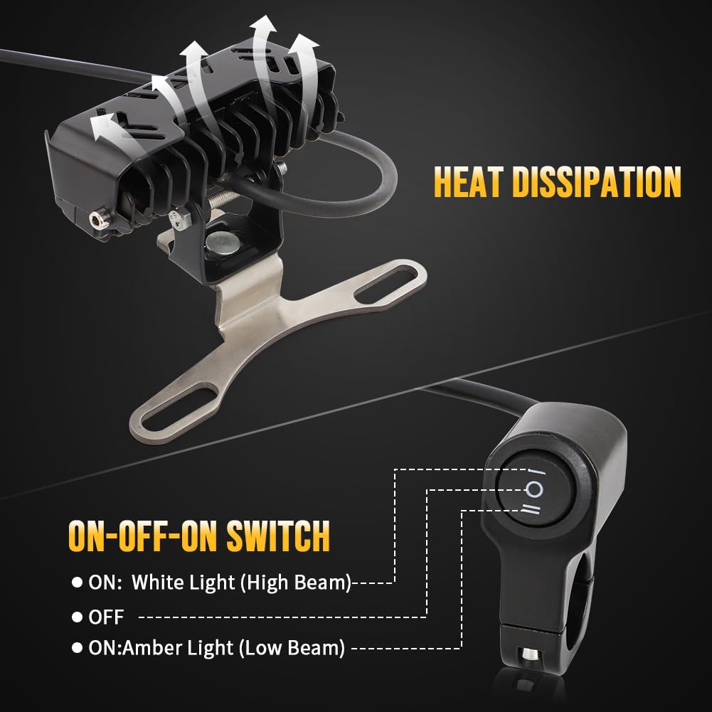 Item Specification Material: Aluminum Product lifetime: 50,000 hours Power: 21W Voltage: 12V-80V Colour temperature: 3000-7000K Lumens: 2200-2800LM --Made with premium material,shell --IP68 waterproof&dustproof, durable for outdoor use --lights are super bright but non glare --Complete wiring harness with pre terminated plugs help you with the installation process --Developed with white light(high beam) and amber light(low beam), offer your night driving a full protection --Come with Universal light bracket, mountable range: 80-120mm(3.14-4.72in) --Universal Fit: Kawasaki, Yamaha,, Honda, Suzuki, 2017-2019 Ski-D oo G4. Simplify installation: you don't need to have a knowledge of maintenance electrician modification. All you need to do is remove the outer hexagonal bolt from the carriage, fix the matching aluminium mounting bracket, connect the power supply and you're ready to use.