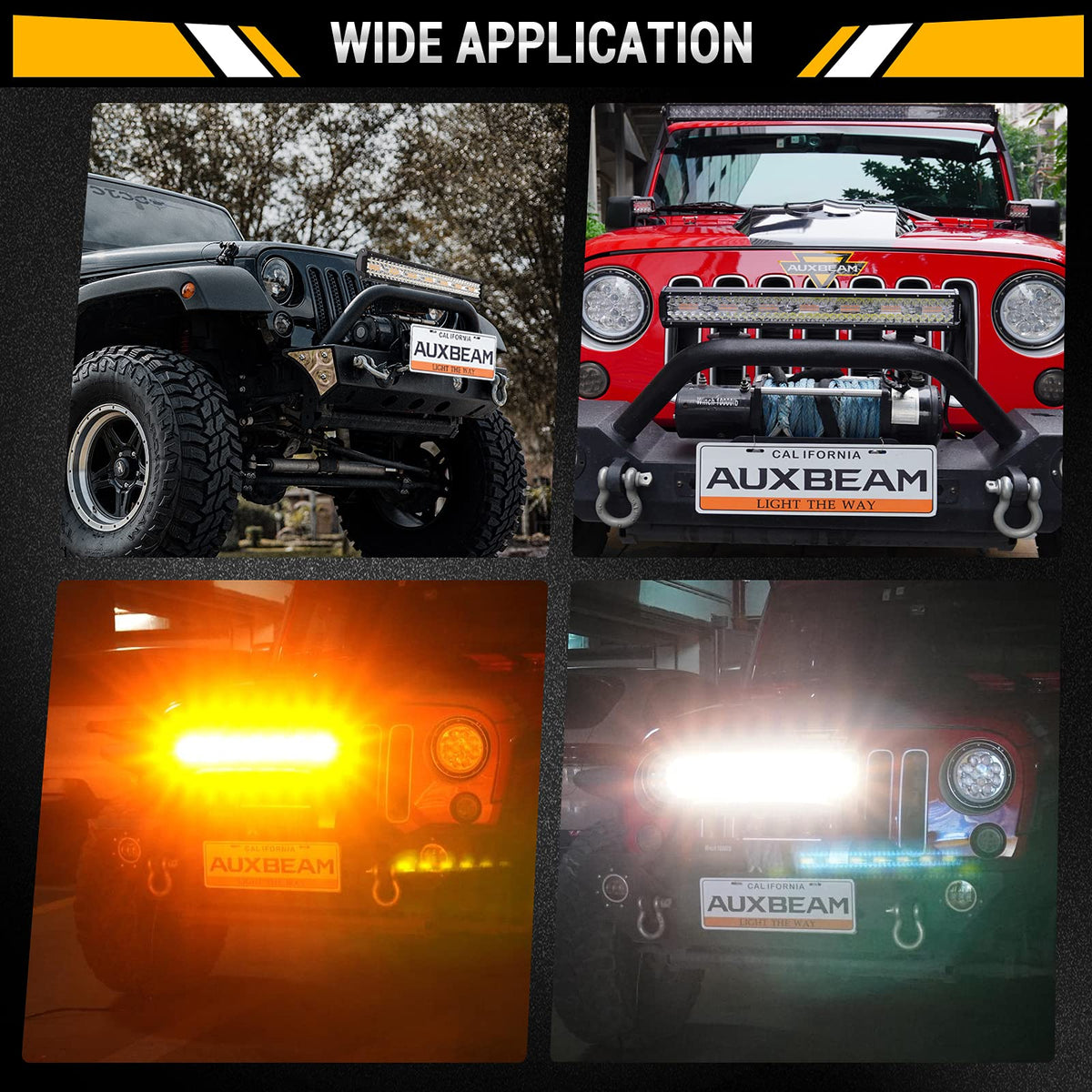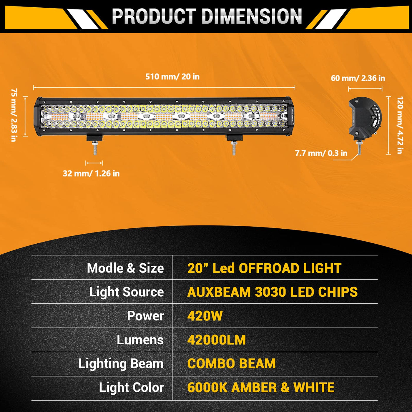 Newest 6 Modes Lighting Design: White light, amber light, white & amber, strobe white, strobe amber, white & amber strobe. You can change each lighting mode in turn by the MODE button of Auxbeam dedicated light bar wiring harness. Press the MODE button for 3sec to restore the white light. | Super Brightness: 20 Inch led light bar with high intensity LED chips,super cool engineering spot flood combo beam pattern design. Amber lights has strong penetration and white lights offer bright illumination, great as warning light, fog lights, driving lights or work lights. | Combo Beam Design: The combination of 60-degree flood beam and 30-degree spot beam makes it lighter and wider to give you an incredibly clear visibility in any terrains, which helps avoid potential hazards on the road ahead. | Premium Heat Dissipation: This led fog light has an aluminum alloy housing and built-in fan with fast cooling heat sink provide extreme heat dissipation effect, effectively extending the life of the running light to over 50,000 hours. | Universal Usages: IP67 rated waterproof & dustproof, durable enough to withstand any harsh environments and the lifespan up to 50,000 hours. Compatible for almost all Jeeps, 4x4, Trucks, Cars, Motorcycles, SUVs, ATVs, Boats.